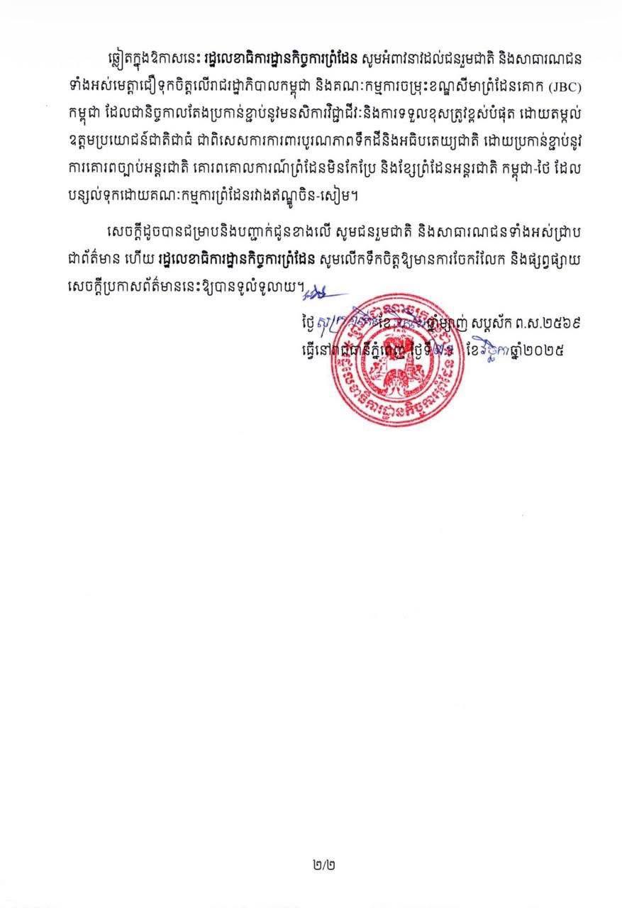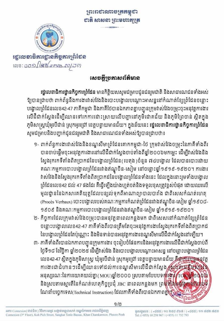 «ពាក់ព័ន្ធការងារវាស់វែងនិង ខណ្ឌ សីមា ព្រំដែន គោកកម្ពុជា-ថៃ ក្រុមវាស់វែង ចម្រុះនៃភាគី ទាំង ពីរ បានចាប់ ផ្តើម ចុះ អនុវត្ត ការងារនៅលើដី ជាក់ ស្ដែង ចាប់តាំង ពីឆ្នាំ២០០៦មកម្លេះ ដើម្បីវាស់វែង និង ស្វែង រុករក ទីតាំង ពិត ប្រាកដ នៃ បង្គោល ព្រំដែន(បេតុង) ចំនួន ៧៤បង្គោល ដែលបាន បោះ ដោយ គណៈកម្មការ បោះ បង្គោលព្រំដែន រវាង ឥណ្ឌូចិន – សៀម នៅចន្លោះ ឆ្នាំ ១៩១៩-១៩២០។ ការងារ វាស់ វែង និងស្វែងរុករកទីតាំង ពិតប្រាកដ នៃបង្គោលព្រំដែន ទាំងនេះ ដែលក្នុងនោះរួមទាំង បង្គោល ព្រំដែន លេខ៤២ ដល់៤៧ ផងដែរ គឺធ្វើ ឡើងយ៉ាង ហ្មត់ចត់ និង ទទួលខុសត្រូវ ខ្ពស់ បំផុត ដោយ ឈរ លើ មូលដ្ឋាន នៃ ឯកសារ គតិយុត្ត ដែល បន្សល់ ទុកពី អាណាព្យាបាលបារាំង ជា ពិសេស កំណត់ ហេតុ (Procès Verbaux) បោះ បង្គោល របស់ គណៈកម្មការ កំណត់ព្រំដែន រវាងឥណ្ឌូចិន – សៀម ឆ្នាំ១៩០៨- ១៩០៩ និង គណៈកម្ម ការ បោះបង្គោល ព្រំដែន រវាង ឥណ្ឌូចិន – សៀម ឆ្នាំ១៩១៩-១៩២០»។ នេះជាសម្រង់ចេញពីសេចក្តីប្រកាសព័ត៌មានរបស់រដ្ឋលេខាធិការដ្ឋានកិច្ចការព្រំដែន កាលពីថ្ងៃទី២១ ខែវិច្ឆិកា កន្លងទៅ ៕