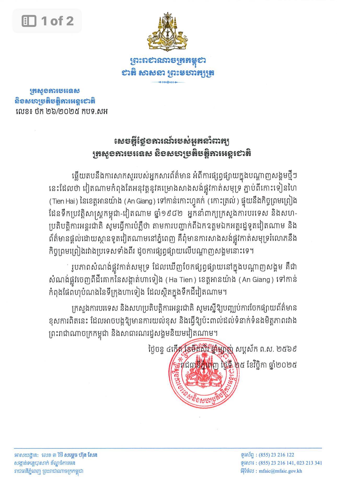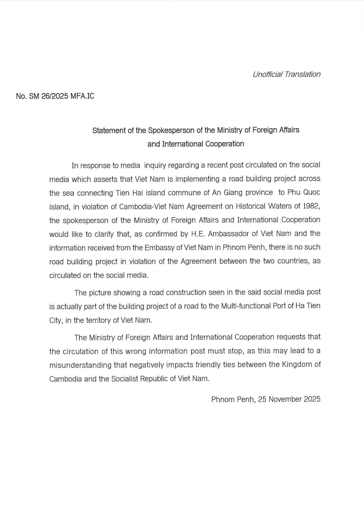 ភ្នំពេញ​៖​ យោងតាម​សេចក្តីថ្លែងការណ៍របស់អ្នកនាំពាក្យក្រសួងការបរទេស និងសហប្រតិបត្តិការអន្តរជាតិ នៅរសៀល​ថ្ងៃ​ទី​២៤​ ខែវិច្ឆិកា​ ឆ្នាំ​២០២៥នេះ​ បានឆ្លើយតបនឹងការសាកសួររបស់អ្នកសារព័ត៌មាន អំពីការផ្សព្វផ្សាយក្នុងបណ្តាញសង្គមថ្មីៗ នេះដែលថា វៀតណាមកំពុងតែអនុវត្តនូវគម្រោងសាងសង់ផ្លូវកាត់សមុទ្រ ភ្ជាប់ពីកោះទៀនហៃ (Tien Hai) នៃខេត្តអានយ៉ាង (An Giang) ទៅកាន់កោះហ្វូគក់ (កោះត្រល់) ផ្ទុយនឹងកិច្ចព្រមព្រៀង ដែនទឹកប្រវត្តិសាស្ត្រកម្ពុជា-វៀតណាម ឆ្នាំ១៩៨២ អ្នកនាំពាក្យក្រសួងការបរទេស និងសហ ប្រតិបត្តិការអន្តរជាតិ សូមធ្វើការបំភ្លឺថា តាមការបញ្ជាក់ពីឯកឧត្តមឯកអគ្គរដ្ឋទូតវៀតណាម និង ព័ត៌មានផ្តល់ដោយស្ថានទូតវៀតណាមនៅភ្នំពេញ គឺពុំមានការសាងសង់ផ្លូវកាត់សមុទ្ររំលោភនឹង កិច្ចព្រមព្រៀងរវាងប្រទេសទាំងពីរ ដូចការផ្សព្វផ្សាយលើបណ្តាញសង្គមនោះទេ។