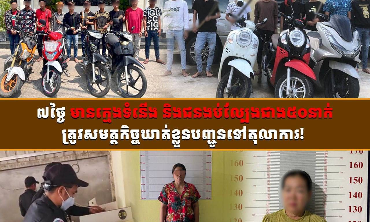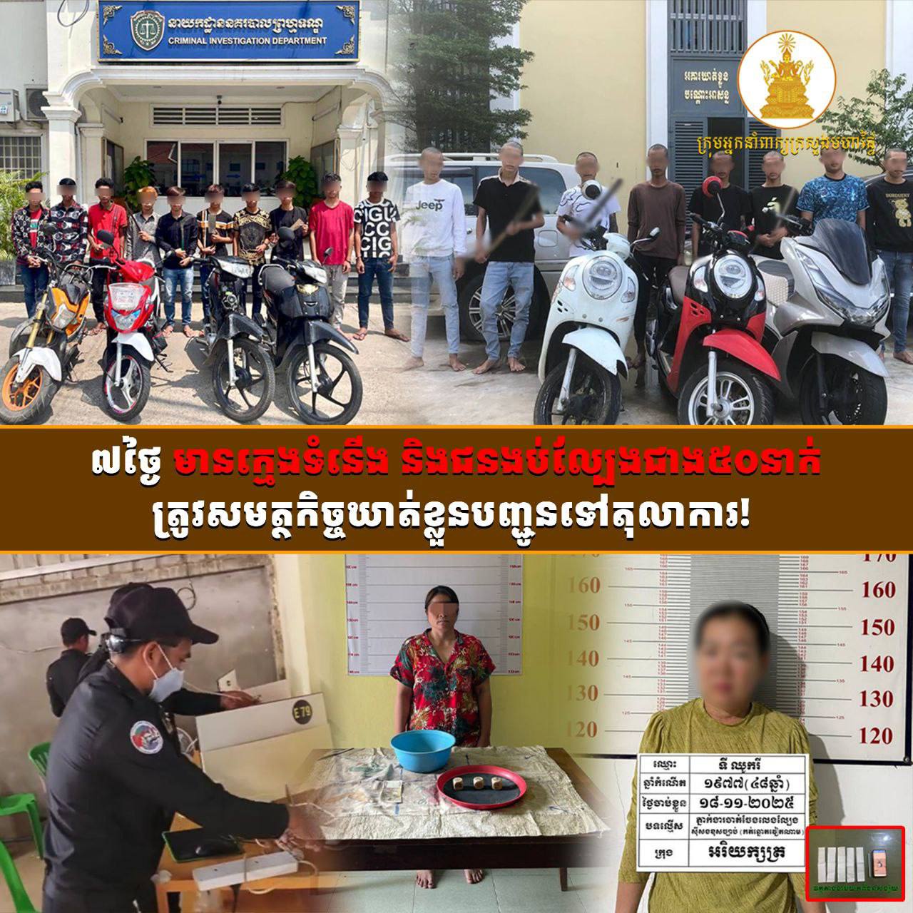 ភ្នំពេញ ៖ ក្នុងរយៈពេល៧ថ្ងៃ គិតចាប់ពីថ្ងៃទី១៧ ដល់ថ្ងៃទី២៣ ខែវិច្ឆិកា ឆ្នាំ២០២៥នេះ សមត្ថកិច្ចនគរបាលជាតិ បានបង្ក្រាបក្មេងទំនើងសរុប១១ករណី ឃាត់ខ្លួនមនុស្ស៣០នាក់ ខណៈករណីល្បែងស៊ីសងបង្ក្រាបបាន ៧ករណី ឃាត់ខ្លួនជនងប់ល្បែង និងអ្នកពាក់ព័ន្ធចំនួន២៣នាក់។ នេះបើតាមលោក ទូច សុឃៈ អ្នកនាំពាក្យរងក្រសួងមហាផ្ទៃ។