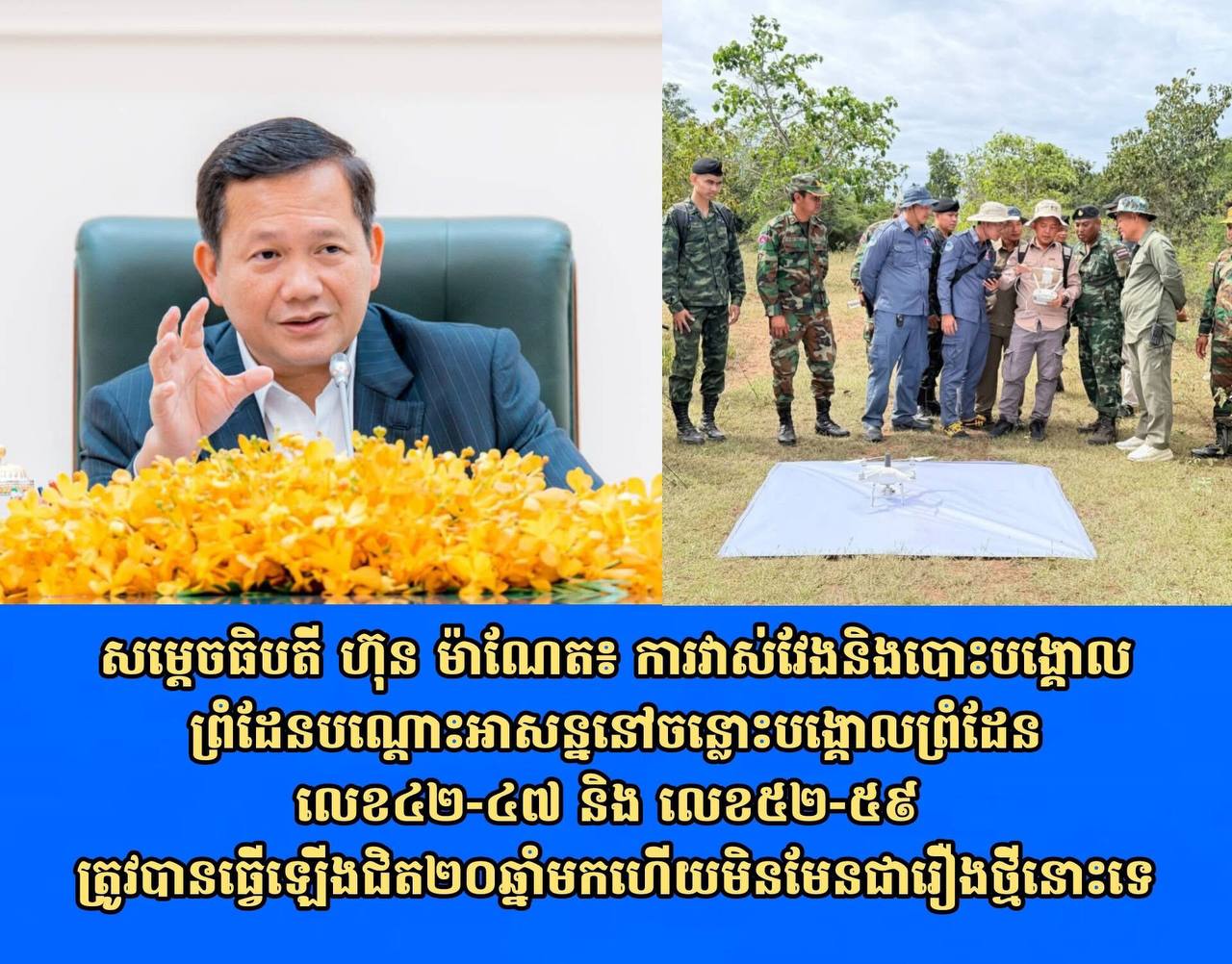 សម្តេចធិបតី ហ៊ុន ម៉ាណែត៖ ការវាស់វែងនិងបោះបង្គោលព្រំដែនបណ្តោះអាសន្ននៅចន្លោះបង្គោលព្រំដែនលេខ៤២-៤៧ និង លេខ៥២-៥៩ ត្រូវបានធ្វើឡើងជិត២០ឆ្នាំមកហើយមិនមែនជារឿងថ្មីនោះទេ
