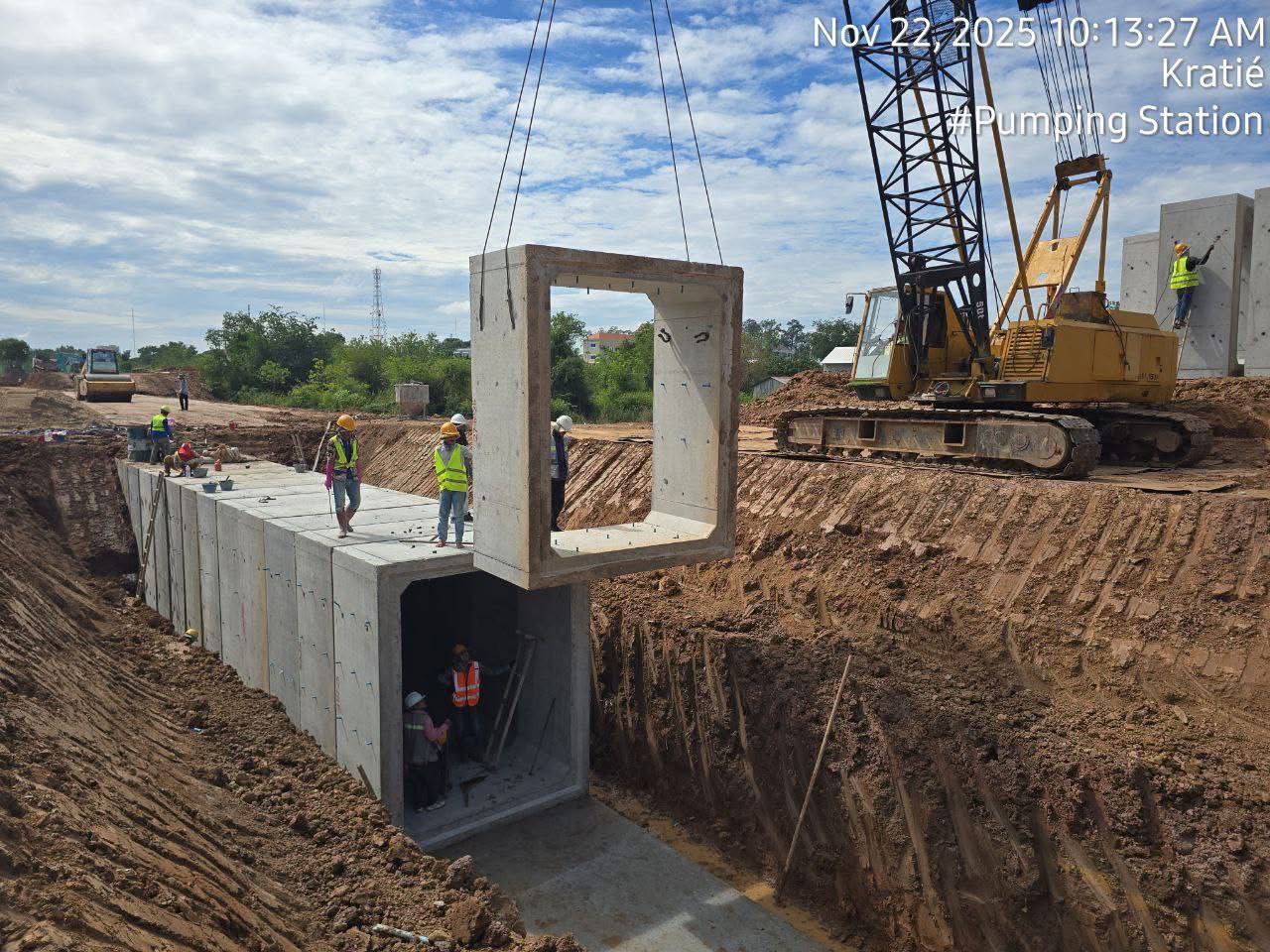 លោកបន្តថា សម្រាប់អនុគម្រោងសាងសង់បណ្តាញលូ និងស្ថានីយបូមទឹកភ្លៀងក្រុងក្រចេះ បានការដ្ឋានសាងសង់នាថ្ងៃទី៥ ខែមីនា ឆ្នាំ ២០២៥ សាងសង់លើផ្ទៃដីទំហំ១៦.៧ម៉ែត្រx៣០ម៉ែត្រ មានសំណង់ម៉ាត់ឈ្នាងបង្ហូរទឹកចេញពីស្ថានីយទំហំ១៣.៤ម៉ែត្រx១៨.៥ម៉ែត្រ បំពាក់ម៉ាស៊ីនបូមទឹកចំនួន ០៣ម៉ាស៊ីន មានសមត្ថភាពបូមទឹកបាន ១០,៣៨០ ម៉ែត្រគូបក្នុងមួយម៉ោង ក្នុងនោះមានចាក់ផ្លូវបេតុងចូលស្ថានីយប្រវែង១១០ម៉ែត្រ ទទឹង ៧.៥ម៉ែត្រ-សាងសង់នូវបណ្តាញ លូរបេតុងប្រអប់មេប្រវែង ១១២៣ម៉ែត្រ -សាងសង់បណ្តាញលូប្រមូលទឹកតភ្ជាប់ជាមួយបណ្តាញលូចាស់ប្រវែង ៤៩៦ម៉ែត្រ និងសាងសង់ប្រឡាយទឹករៀបថ្ម ទំហំទទឹងបាតប្រឡាយ១.៥ម៉ែត្រ ជម្រៅ៣ម៉ែត្រ ប្រវែង២២០ម៉ែត្រ សម្រេចបាន ៣៩,៩៨% ។