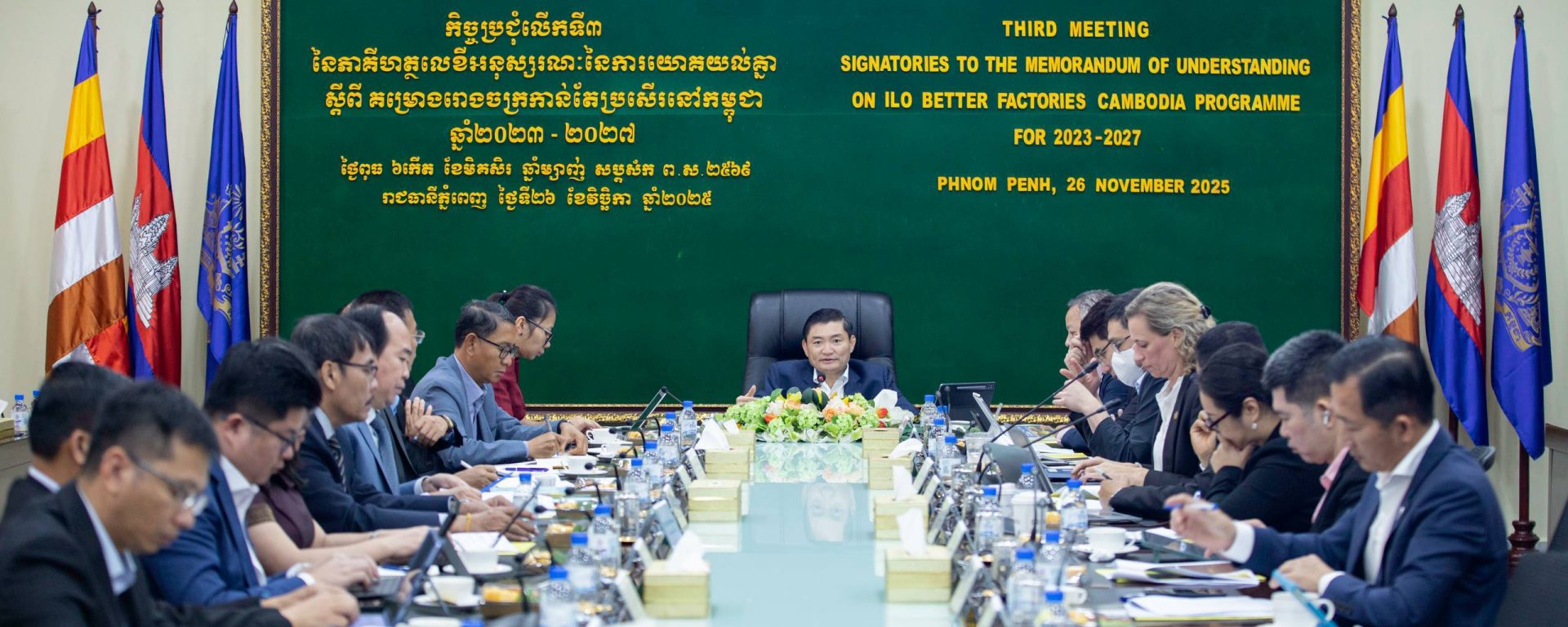 ភ្នំពេញ៖ លោក ហេង សួរ រដ្ឋមន្ត្រីក្រសួងការងារ និងបណ្តុះបណ្តាលវិជ្ជាជីវៈ បានអញ្ជើញដឹកនាំកិច្ចប្រជុំលើកទី៣ នៃភាគីហត្ថលេខីអនុស្សរណៈនៃការយោគយល់គ្នាស្ដីពីគម្រោងរោងចក្រកាន់តែប្រសើរនៅកម្ពុជា ឆ្នាំ២០២៣-២០២៧ ដោយមានការចូលរួមពីភាគីហត្ថលេខី ដែលរួមមានតំណាងក្រសួងពាណិជ្ជកម្ម តំណាងសមាគមវាយនភណ្ឌ សម្លៀកបំពាក់ ស្បែកជើង និងផលិតផលធ្វើដំណើរនៅកម្ពុជា (TAFTAC) និងតំណាងអង្គការអន្តរជាតិខាងការងារ (ILO) នៅព្រឹកថ្ងៃទី២៦ ខែវិច្ឆិកា ឆ្នាំ២០២៥ នៅទីស្តីការក្រសួង ដើម្បីពិនិត្យលើវឌ្ឍនភាព បញ្ហាប្រឈម និងទិសដៅការងាររបស់គម្រោងរោងចក្រកាន់តែប្រសើរនៅកម្ពុជា ព្រមទាំងបន្តពង្រឹងកិច្ចសហការរវាងភាគីហត្ថលេខីនៃអនុស្សរណៈនៃការយោគយល់គ្នា។