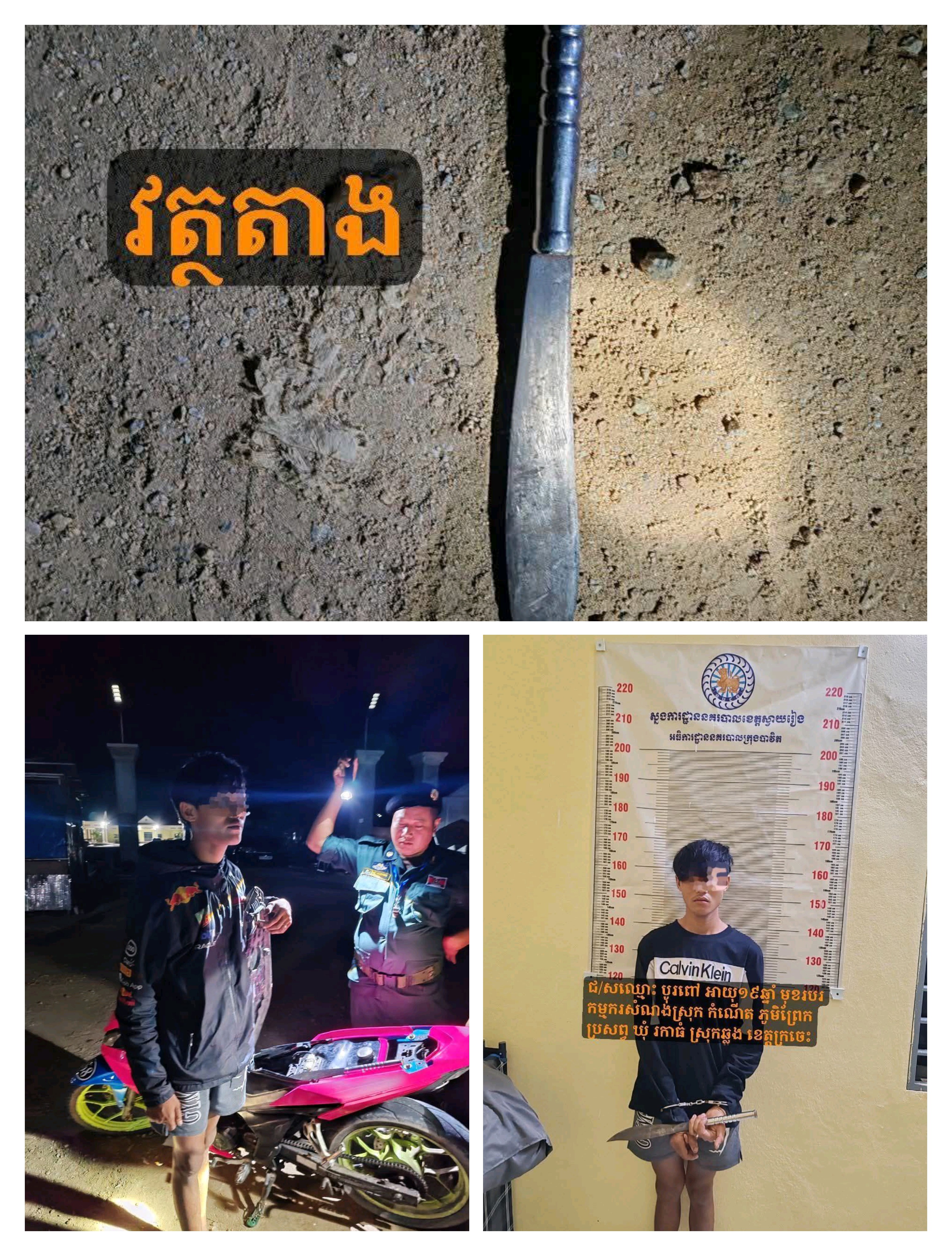 សមត្ថកិច្ចបញ្ជាក់ទៀតថា កាលពីថ្ងៃទី២៥ ខែវិច្ឆិកា ឆ្នាំ២០២៥ វេលាម៉ោង១១និង១០នាទីយប់ កម្លាំងអធិការដ្ឋាននគរបាលក្រុងបាវិតបានចុះដាក់គោលដៅអនុវត្តន៍ ត្រួតពិនិត្យរកសារធាតុញៀន អាវុធជាតិផ្ទុះ ស្ថិតនៅភូមិត្រពាំងប្លុង សង្កាត់បាទី ក្រុងបាវិត និងបានត្រួតពិនិត្យលើម៉ូតូ១គ្រឿងម៉ាក់Excerterពណ៌ផ្កាឈូក គ្មានស្លាកលេខ បើកបរដោយបុរសម្នាក់ រួចក៏ធ្វើការត្រួតពិនិត្យស្រាប់តែប្រទះឃើញកាំបិតកែច្នៃ១ដើមនៅក្នុងឃ្លុបម៉ូតូ។