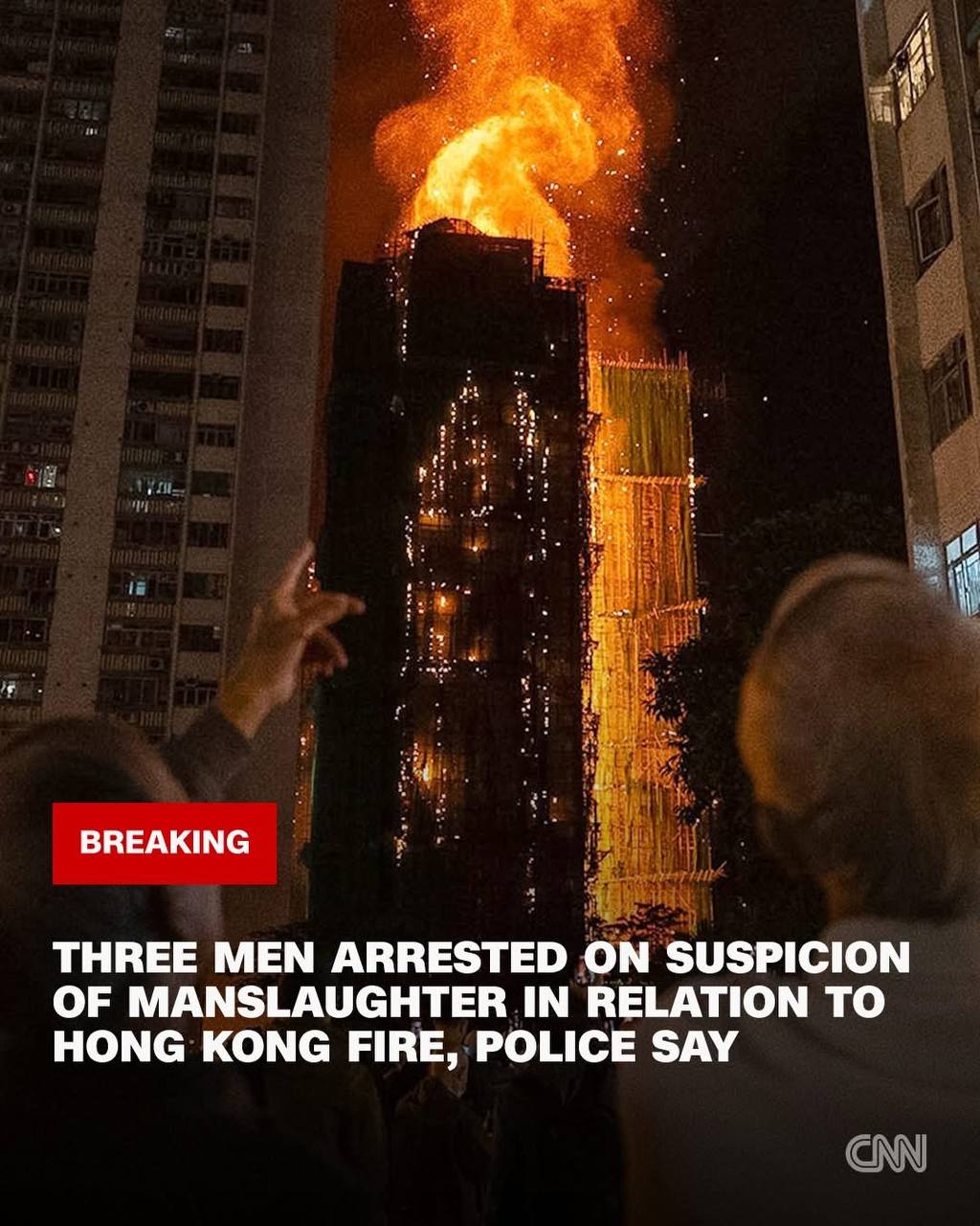 អន្តរជាតិ ៖ ប្រភពពី (CNN) ថ្ងៃនេះ ! បានផ្សាយថា ៖ ប៉ូលីសនិយាយថា បុរសបីនាក់ត្រូវបានចាប់ខ្លួនពាក់ព័ន្ធនឹងអគ្គីភ័យឆាបឆេះអគារខ្ពស់កប់ពពកនៅទីក្រុងហុងកុង។ មនុស្សរាប់រយនាក់នៅតែបាត់ខ្លួន !