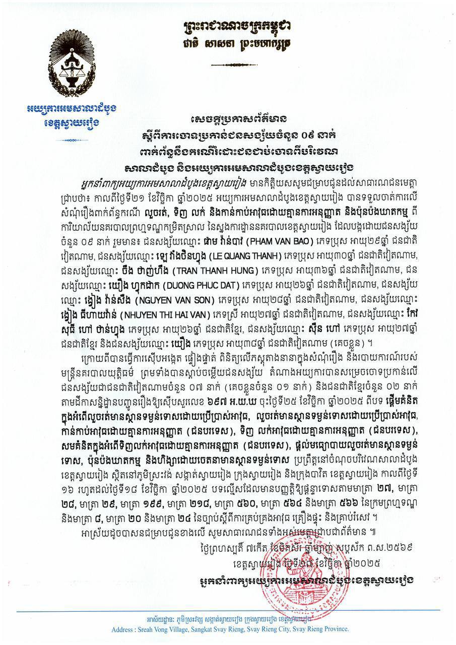 ខេត្ត​ស្វាយរៀង​៖​ អ្នកនាំពាក្យអយ្យការអមសាលាដំបូងខេត្តស្វាយរៀង នៅថ្ងៃទី​២៧​ ខែវិច្ឆិកា​ ឆ្នាំ​២០២៥នេះ​ មានកិត្តិយសសូមជម្រាបជូនដល់សាធារណជនមេត្តា ជ្រាបថា៖ កាលពីថ្ងៃទី២១ ខែវិច្ឆិកា ឆ្នាំ២០២៥ អយ្យការអមសាលាដំបូងខេត្តស្វាយរៀង បានទទួលចាត់ការលើ សំណុំរឿងពាក់ព័ន្ធករណី លួចរត់, ទិញ លក់ និងកាន់កាប់អាវុធដោយគ្មានការអនុញ្ញាត និងប៉ុនប៉ងឃាតកម្ម ពី ការិយាល័យនគរបាលព្រហ្មទណ្ឌកម្រិតស្រាល នៃស្នងការដ្ឋាននគរបាលខេត្តស្វាយរៀង ដែលបង្កដោយជនសង្ស័យ ចំនួន ០៩ នាក់ រួមមាន៖ ជនសង្ស័យឈ្មោះ ផាម វ៉ាន់បាវ (PHAM VAN BAO) ភេទប្រុស អាយុ២៩ឆ្នាំ ជនជាតិ វៀតណាម, ជនសង្ស័យឈ្មោះ ឡេ វាំងថិនហ្វុង (LE QUANG THANH) ភេទប្រុស អាយុ៣០ឆ្នាំ ជនជាតិវៀតណាម, ជនសង្ស័យឈ្មោះ ចឹង ថាញ់ហឹង (TRAN THANH HUNG) ភេទប្រុស អាយុ៣៦ឆ្នាំ ជនជាតិវៀតណាម, ជន សង្ស័យឈ្មោះ យឿង ហុកដាក (DUONG PHUC DAT) ភេទប្រុស អាយុ២៦ឆ្នាំ ជនជាតិវៀតណាម, ជនសង្ស័យ ឈ្មោះ ង្វៀង វ៉ាន់សឺង (NGUYEN VAN SON) ភេទប្រុស អាយុ២៨ឆ្នាំ ជនជាតិវៀតណាម, ជនសង្ស័យឈ្មោះ ង្វៀង ធីហាយវ៉ាន់ (NHUYEN THI HAI VAN) ភេទស្រី អាយុ២៧ឆ្នាំ ជនជាតិវៀតណាម, ជនសង្ស័យឈ្មោះ កែវ សុធី ហៅ ថាន់ហ្វុង ភេទប្រុស អាយុ២៦ឆ្នាំ ជនជាតិខ្មែរ, ជនសង្ស័យឈ្មោះ ស៊ីន ហៅ ភេទប្រុស អាយុ២៧ឆ្នាំ ជនជាតិខ្មែរ និងជនសង្ស័យឈ្មោះ យឿង ភេទប្រុស អាយុ៣៨ឆ្នាំ ជនជាតិវៀតណាម (គេចខ្លួន) ។