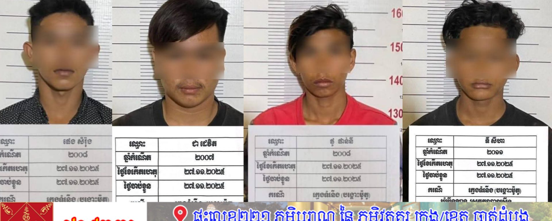 ខេត្តកណ្ដាល÷មន្ត្រីនគរបាលនៅអធិការដ្ឋាននគរបាលស្រុកកណ្ដាលស្ទឹងនៅថ្ងៃ ២៨ ខែវិច្ឆិកា ឆ្នាំ២០២៥នេះឲ្យដឹងថា កម្លាំងនគរបាលប៉ុស្តិ៍រដ្ឋបាលបឹងខ្យាងនិងកម្លាំងប្រជាការពារបានឃាត់ ខ្លួនក្រុមក្មេងទំនើង៤នាក់ ដែលកំពុងធ្វើសកម្មភាពបង្ហោះម៉ូតូតាមផ្លូវសាធារណៈ។ ហេតុការណ៍នេះកើត ឡើងនៅវេលាម៉ោង ២០និង១០ នាទី ថ្ងៃទី២៧ វិច្ឆិកា ២០២៥ នៅលើផ្លូវបេតុងក្រវ៉ាត់ព្រលានយន្តហោះអន្តរជាតិតេជោ ស្ថិតក្នុងភូមិកំពង់តាឡុង ឃុំបឹងខ្យាង ស្រុកកណ្ដាលស្ទឹង ខេត្តកណ្ដាល។
