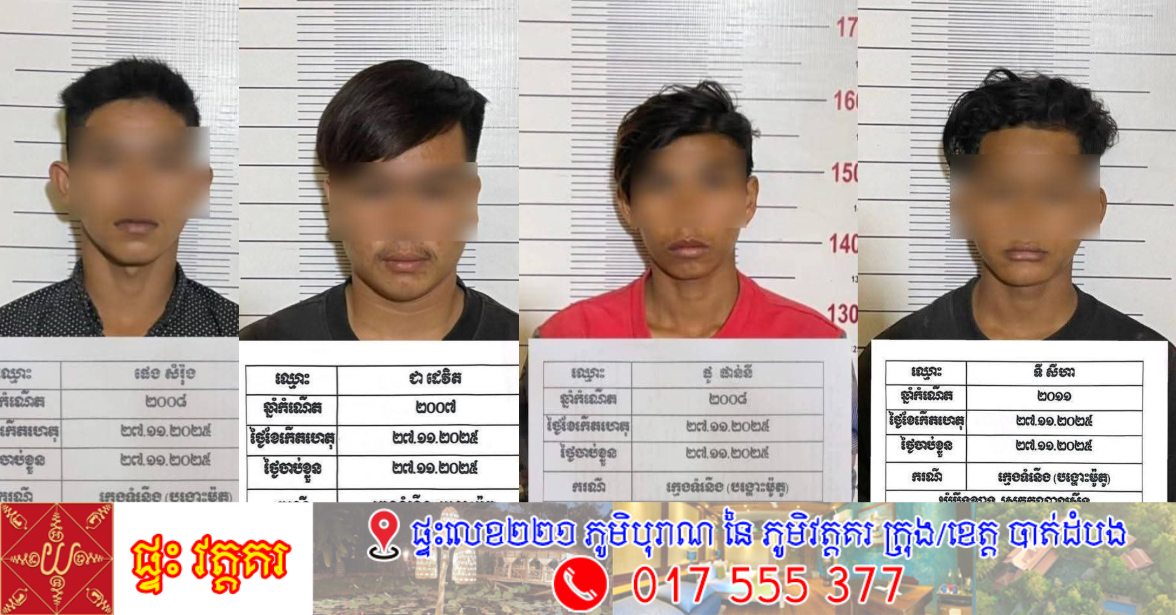 ប្រភពសមត្ថកិច្ចបានឲ្យដឹងថា ក្រុមក្មេងទំនើងទាំង ៤ នាក់ដែលត្រូវបានឃាត់ខ្លួនរួមមាន៖ យុវជនទី១ ឈ្មោះ ជា ដេវិត ភេទប្រុស អាយុ ១៨ឆ្នាំមុខរបររត់តុ, យុវជនទី២ ឈ្មោះ ហេង សំរ៉ុង ភេទ ប្រុស អាយុ ១៧ឆ្នាំ មុខ របរកម្មកររោងចក្រ,យុវជនទី៣ឈ្មោះផូ ផាន់នី ភេទ ប្រុស អាយុ ១៧ឆ្នាំមុខរបររត់តុ និងទី៤ ឈ្មោះ ទី សីហា ភេទ ប្រុស អាយុ ១៤ឆ្នាំ មុខរបរកម្មករដែក។