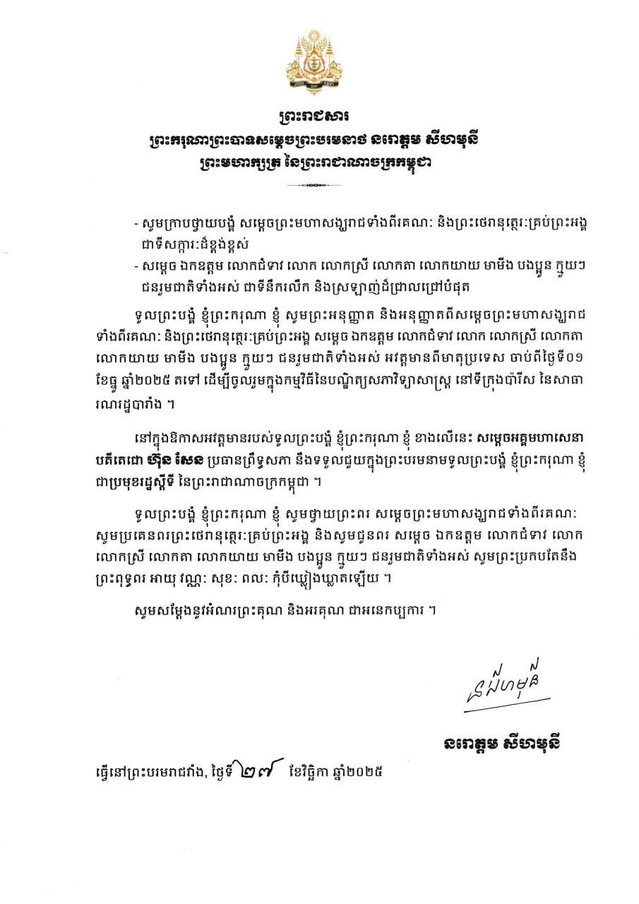 ភ្នំពេញ ៖ ព្រះករុណាព្រះបាទសម្តេចព្រះបរមនាថ នរោត្តម សីហមុនី ព្រះមហាក្សត្រ នៃព្រះរាជាណាចក្រកម្ពុជា នឹងអវត្តមានពីមាតុប្រទេស ចាប់ពីថ្ងៃទី០១ ខែធ្នូ ឆ្នាំ២០២៥ តទៅ ដើម្បីចូលរួមក្នុងកម្មវិធីនៃបណ្ឌិត្យសភាវិទ្យាសាស្ត្រ នៅទីក្រុងប៉ារីស នៃសាធា រណរដ្ឋបារាំង ។