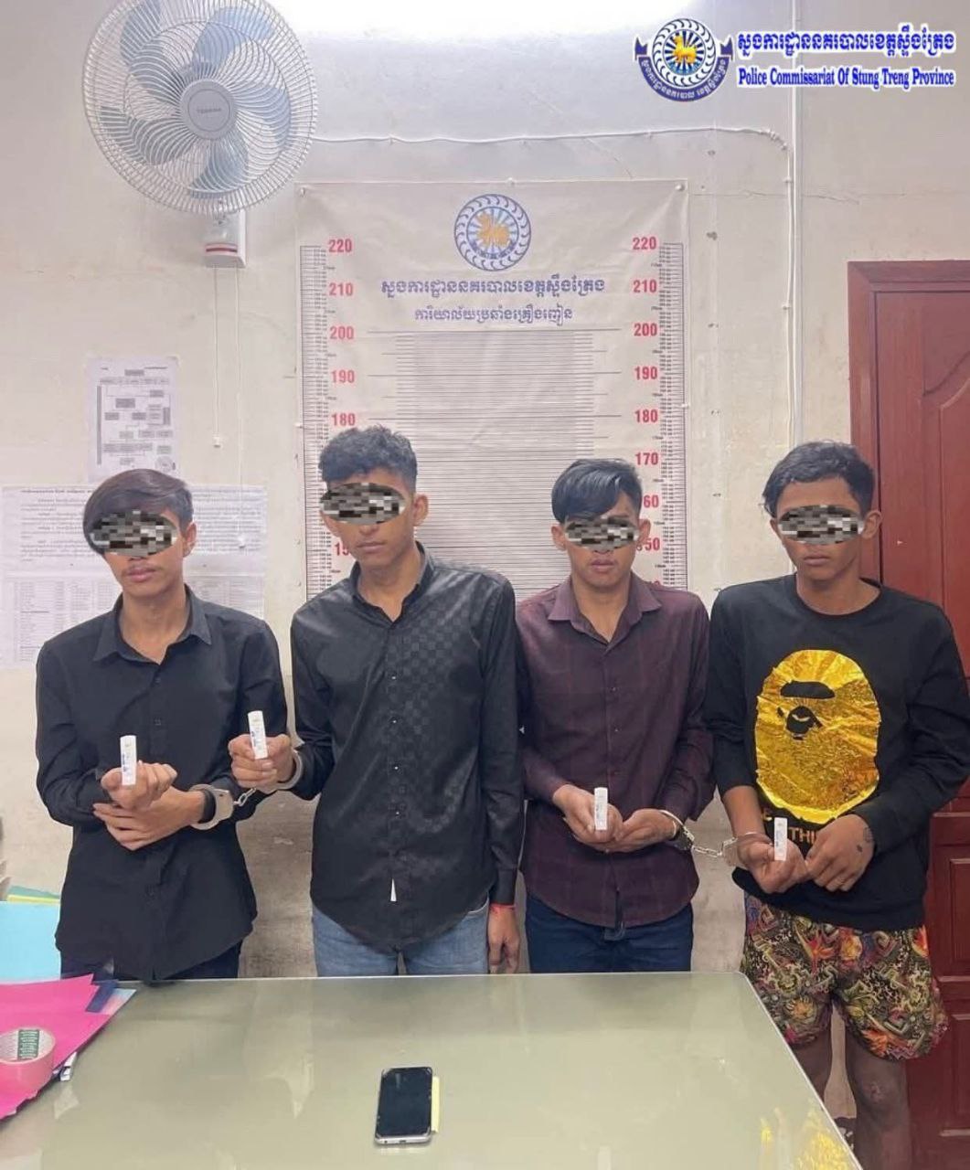 ពេលនោះកម្លាំងជំនាញបាន ប្រមូលក្មេងៗទាំងអស់នោះសរុបមានចំនួន ២៤នាក់ ស្រីចំនួន ០៤នាក់ មកស្នងការដ្ឋាននគរបាលខេត្តស្ទឹងត្រែង ដើម្បីសាកសួរ ។ កម្លាំងជំនាញពិនិត្យឃើញថាក្រុមក្មេងទាំងអស់ខាងលើ មកពីតាមបណ្ដាស្រុក-ក្រុង៤(ថាឡា-សេសា- អូរស្វាយ និងក្រុង) កម្លាំងជំនាញបានធ្វើតេស្តស្វែងរកសារធាតុញៀន ជាលទ្ធផល មានដូចខាងក្រោម៖