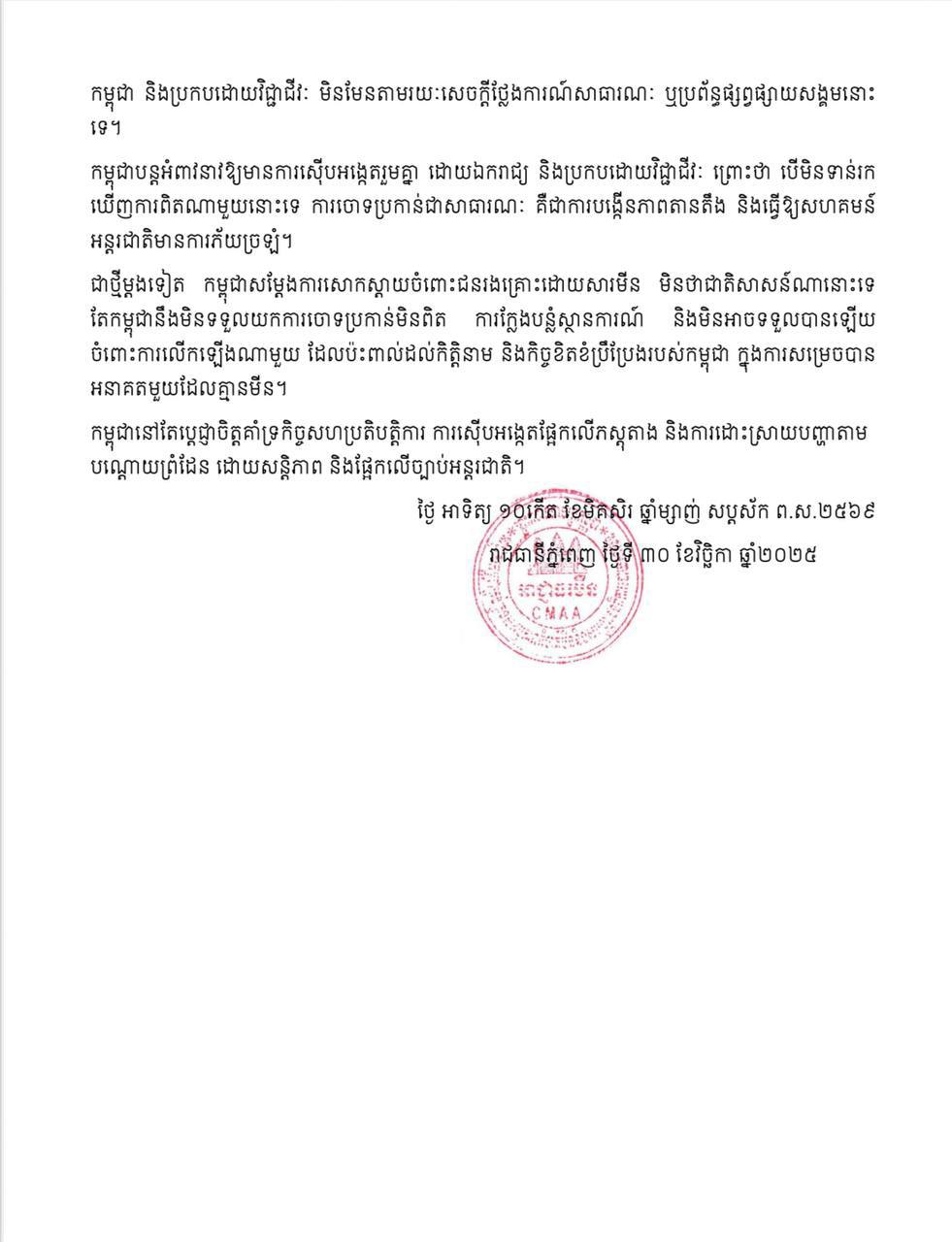កម្ពុជានៅតែប្តេជ្ញាចិត្តគាំទ្រកិច្ចសហប្រតិបត្តិការ ការស៊ើបអង្កេតផ្អែកលើភស្តុតាង និងការដោះស្រាយបញ្ហាតាម បណ្តោយព្រំដែន ដោយសន្តិភាព និងផ្អែកលើច្បាប់អន្តរជាតិ៕ដោយ៖តារា