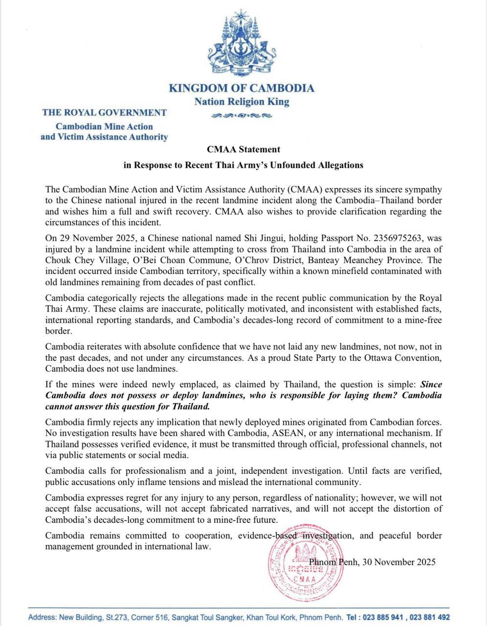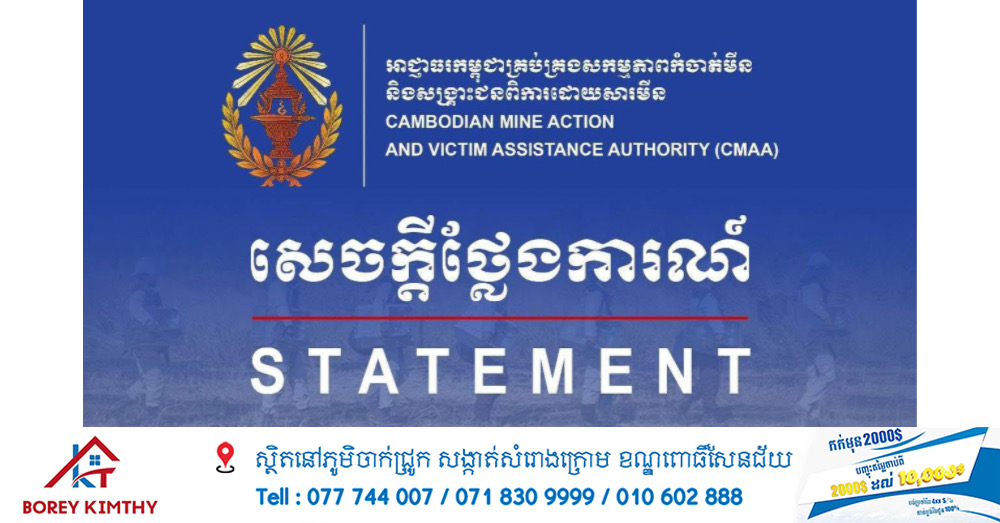 ភ្នំពេញ៖ អាជ្ញាធរកម្ពុជាគ្រប់គ្រងសកម្មភាពកំចាត់មីន និងសង្គ្រោះជនពិការដោយសារមីន (អាជ្ញាធរមីន) សូមសម្តែង ការសោកស្តាយចំពោះជនជាតិចិន ដែលបានរងរបួសក្នុងឧប្បត្តិហេតុផ្ទុះមីន នៅតាមបណ្តោយព្រំដែនកម្ពុជា-ថៃ នាពេលថ្មីៗនេះ និងសូមជូនពរឱ្យជាសះស្បើយឆាប់រហ័ស។ ជាមួយគ្នានេះ អាជ្ញាធរមីន សូមផ្តល់ការបំភ្លឺ ទាក់ទងនឹងឧប្បត្តិហេតុនេះ ដូចខាងក្រោម។