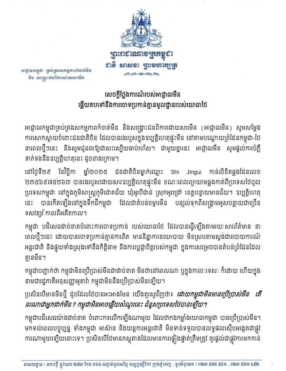 កម្ពុជាបដិសេធយ៉ាងដាច់ខាត ចំពោះការលើកឡើងណាមួយ ដែលថាកងកម្លាំងយោធាកម្ពុជា បានប្រើប្រាស់មីន។ មកទល់ពេលបច្ចុប្បន្ន ទាំងកម្ពុជា អាស៊ាន និងយន្តការអន្តរជាតិ មិនទាន់ទទួលបានលទ្ធផលស៊ើបអង្កេតជាផ្លូវ ការណាមួយឡើយនោះទេ។ ប្រសិនបើថៃមានភស្តុតាងដែលមានការផ្ទៀងផ្ទាត់ត្រឹមត្រូវ គួរផ្តល់ជាផ្លូវការមកកាន់កម្ពុជា និងប្រកបដោយវិជ្ជាជីវៈ មិនមែនតាមរយៈសេចក្តីថ្លែងការណ៍សាធារណៈ ឬប្រព័ន្ធផ្សព្វផ្សាយសង្គមនោះ ទេ។