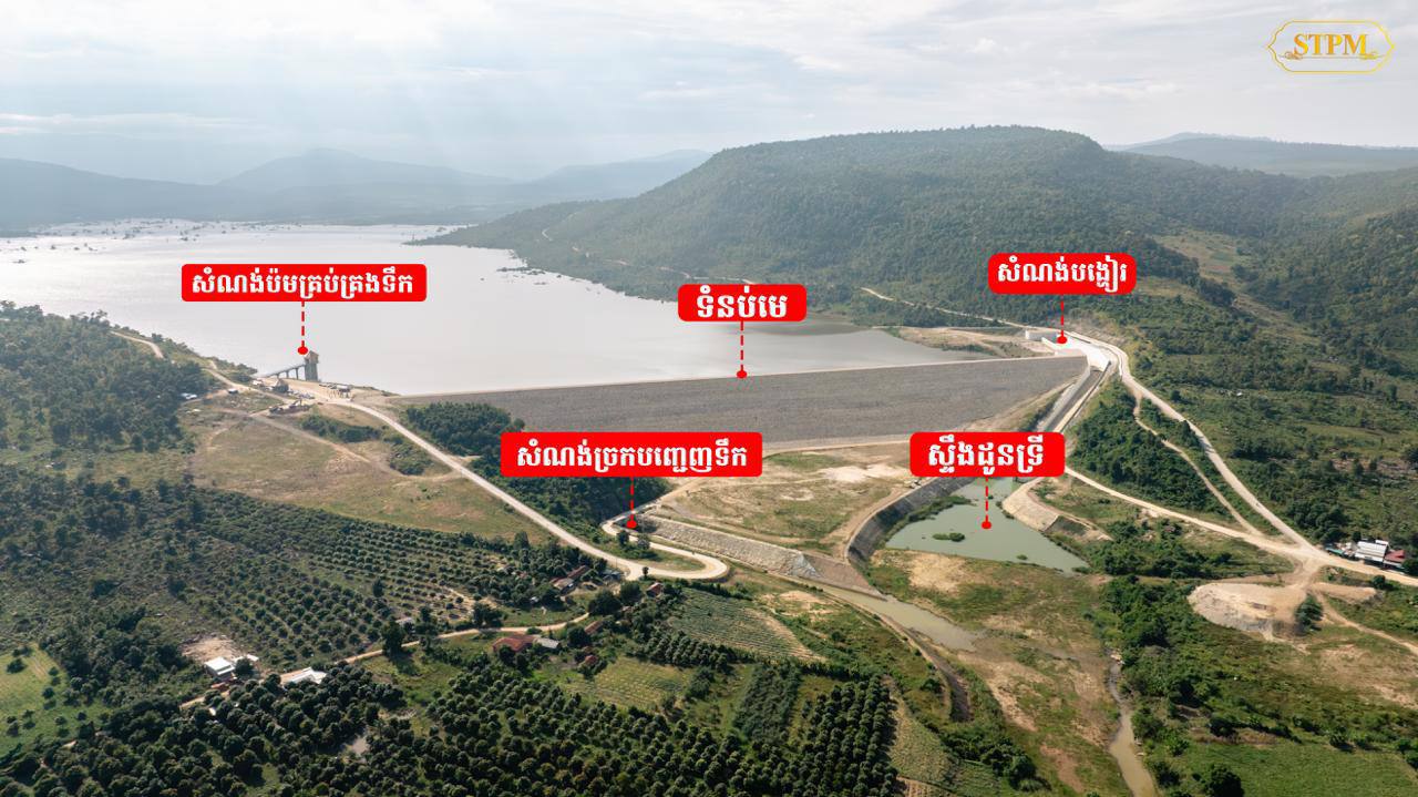 ទី១/ ទំនប់ស្នូលដីថ្មបំពេញ Earth-Core Rockfill Dam (ECRD) ដែលមានខ្នងលើទទឹង ៨ ម៉ែត្រ កម្ពស់ ៦០ ម៉ែត្រពីគ្រឹះ និងប្រវែងសរុប ៦៥៤ ម៉ែត្រ ដែលមានសមត្ថភាពផ្ទុកទឹកប្រសិទ្ធភាពបាន ១៣៣ លានម៉ែត្រគូប។