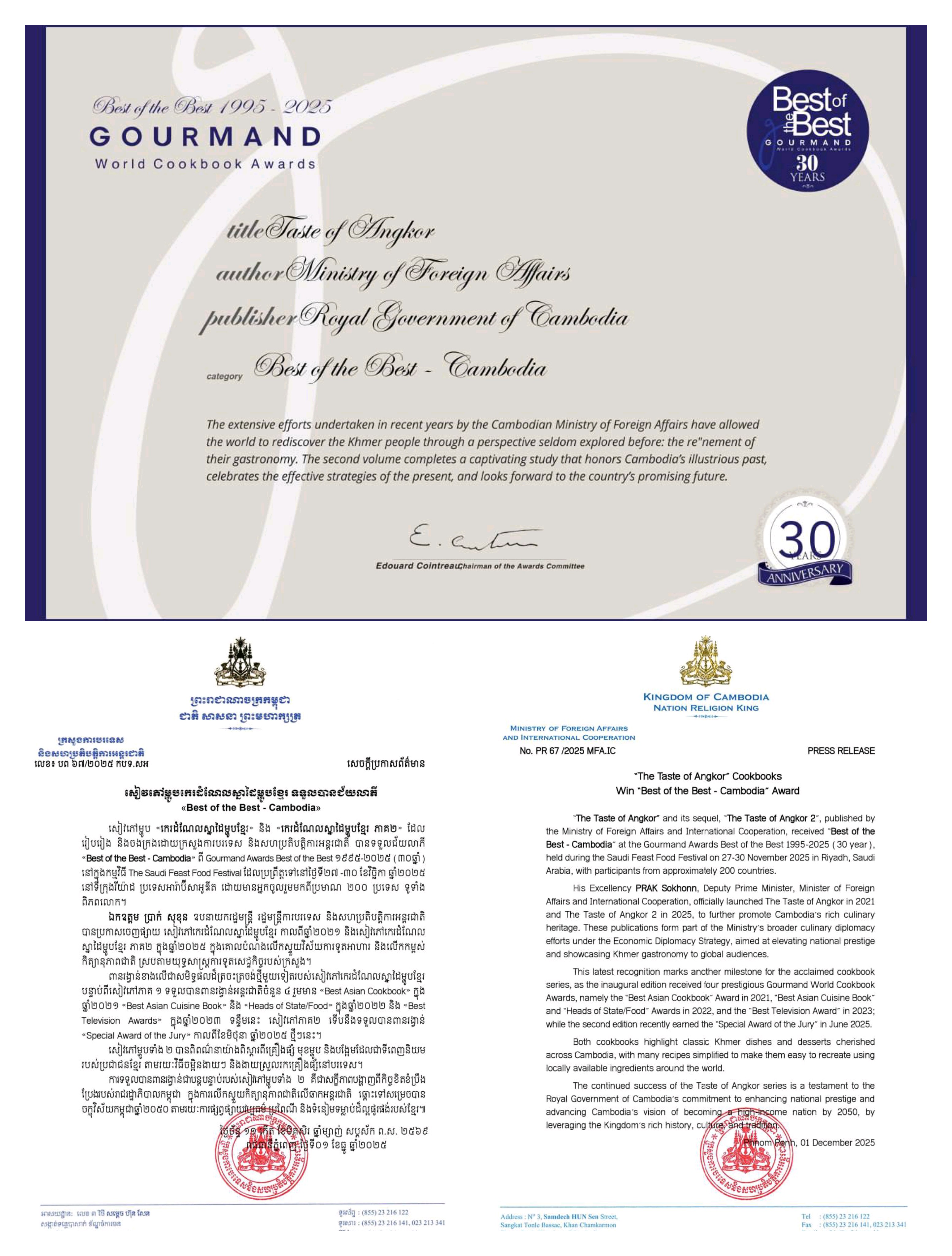 ភ្នំពេញ៖ សៀវភៅម្ហូប «កេរដំណែលស្នាដៃម្ហូបខ្មែរ» និង «កេរដំណែលស្នាដៃម្ហូបខ្មែរ ភាគ២» ដែល រៀបរៀង និងចងក្រងដោយក្រសួងការបរទេស និងសហប្រតិបត្តិការអន្តរជាតិ បានទទួលជ័យលាភី <<Best of the Best – Cambodia ពី Gourmand Awards Best of the Best ១៩៩៥-២០២៥ (៣០ឆ្នាំ) នៅក្នុងកម្មវិធី The Saudi Feast Food Festival ដែលប្រព្រឹត្តទៅនៅថ្ងៃទី២៧-៣០ ខែវិច្ឆិកា ឆ្នាំ២០២៥ នៅទីក្រុងរីយ៉ាដ ប្រទេសអារ៉ាប៊ីសាអូឌីត ដោយមានអ្នកចូលរួមមកពីប្រមាណ ២០០ ប្រទេស ទូទាំង ពិភពលោក។