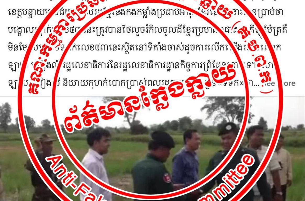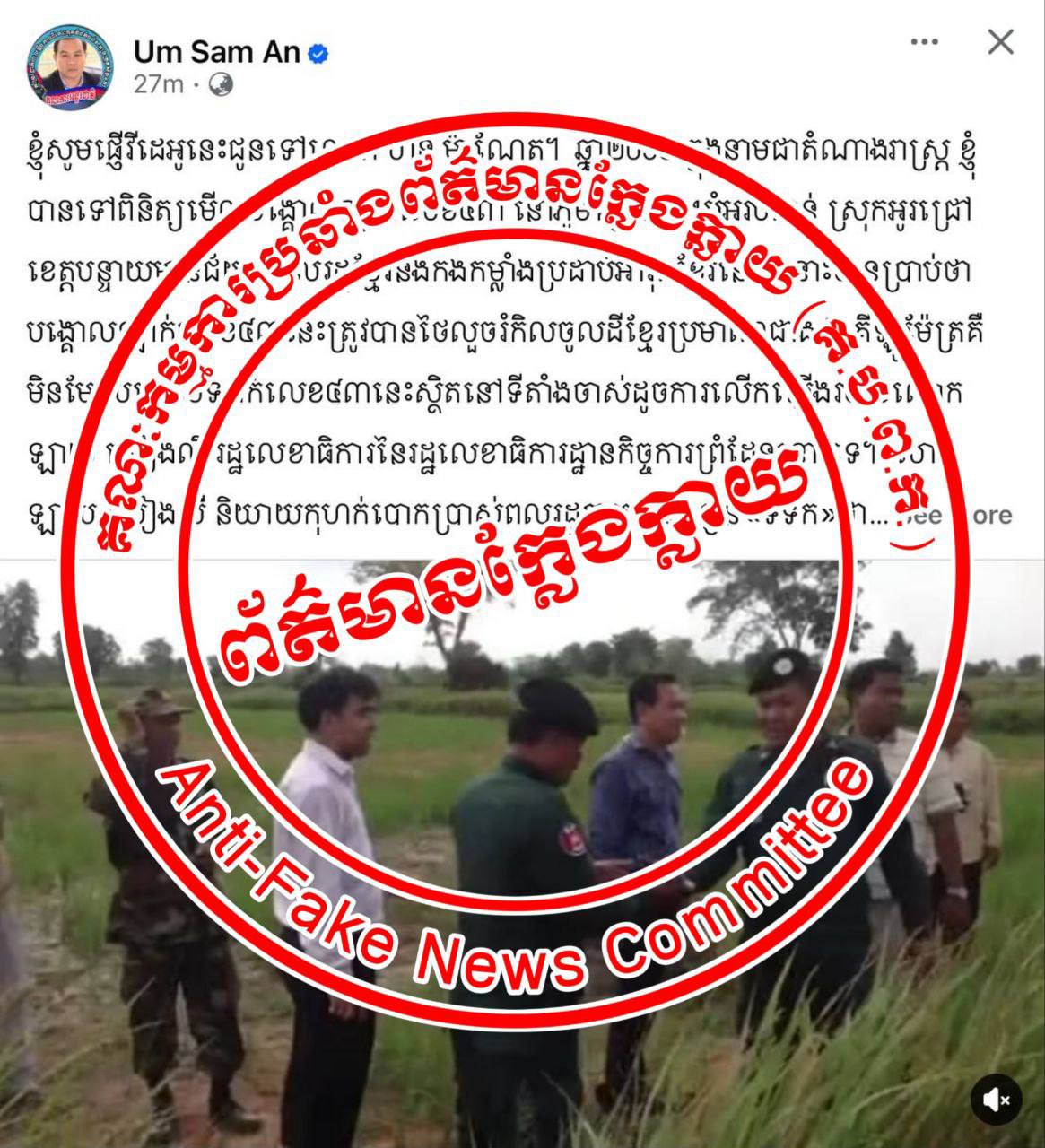 ភ្នំពេញ៖ ជាថ្មីម្តងទៀត បុគ្គល អ៊ុំ សំអាន ដែលជាអតីតទណ្ឌិតជាប់ពន្ធនាគារដោយសារតែការបំភ្លៃបំផ្លើសលើបញ្ហាព្រំដែន បានបំភ្លៃខុសការពិតលើបញ្ហាព្រំដែន។ បុគ្គលរូបនេះបាននិងកំពុងប្រើប្រាស់បណ្តាញសង្គមហ្វេសប៊ុកផ្សព្វផ្សាយព័ត៌មានមិនពិត និងបំភ្លៃលើការងារបោះបង្គោលខណ្ឌសីមាព្រំដែនពីក្រៅប្រទេស។