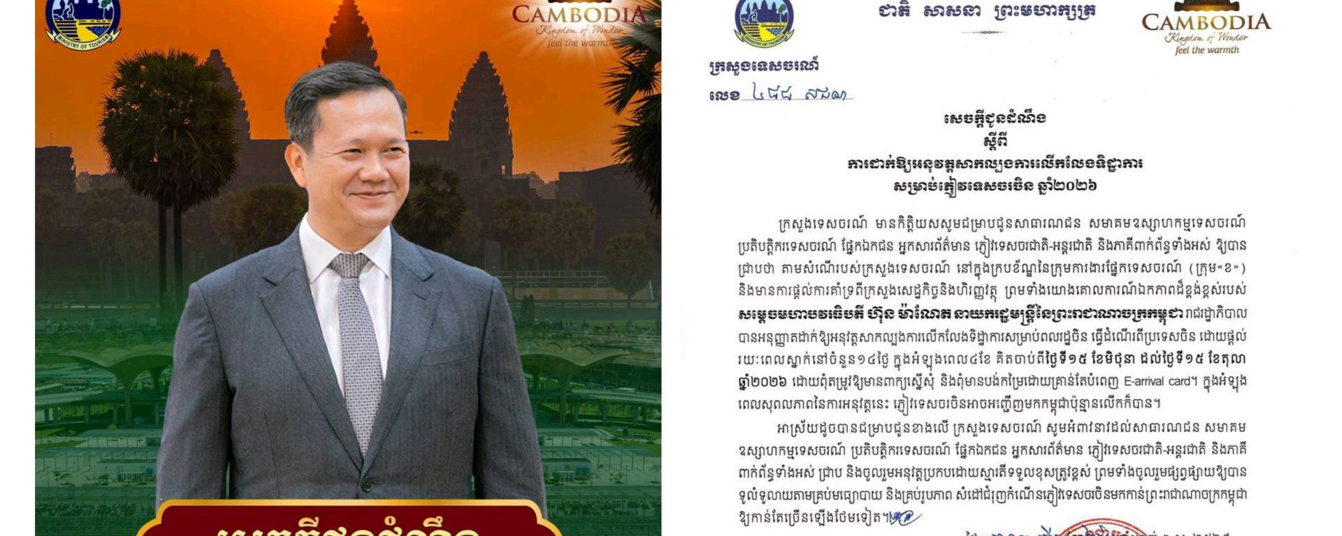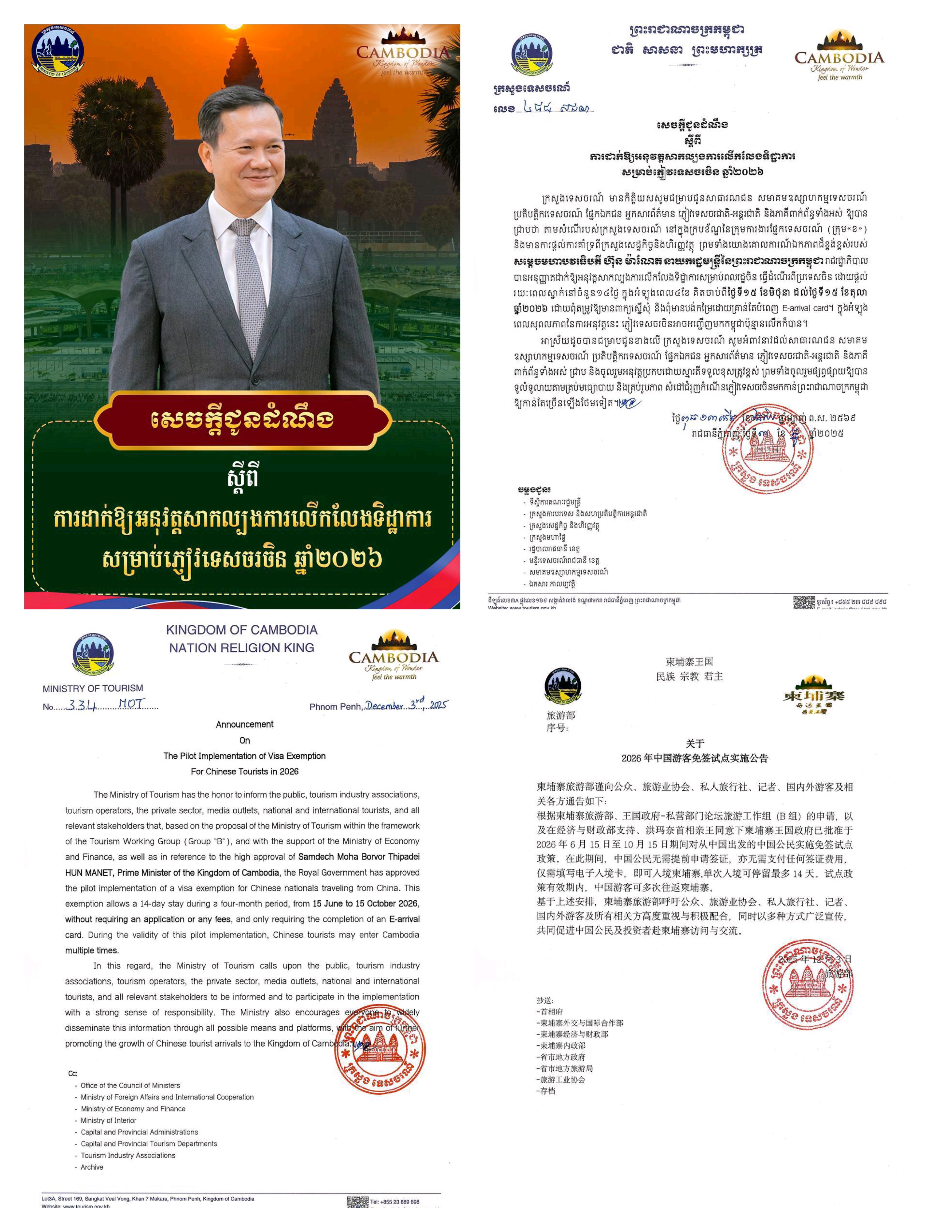 ភ្នំពេញ​៖​ ក្រសួងទេសចរណ៍ នៅថ្ងៃទី​០៣​ ខែធ្នូ​ ឆ្នាំ​២០២៥នេះ​ មានកិត្តិយសសូមជម្រាបជូនសាធារណជន សមាគមឧស្សាហកម្មទេសចរណ៍ ប្រតិបត្តិករទេសចរណ៍ ផ្នែកឯកជន អ្នកសារព័ត៌មាន ភ្ញៀវទេសចរជាតិ-អន្តរជាតិ និងភាគីពាក់ព័ន្ធទាំងអស់ ឱ្យបាន ជ្រាបថា តាមសំណើរបស់ក្រសួងទេសចរណ៍ នៅក្នុងក្របខ័ណ្ឌនៃក្រុមការងារផ្នែកទេសចរណ៍ (ក្រុម«ខ») និងមានការផ្តល់ការគាំទ្រពីក្រសួងសេដ្ឋកិច្ចនិងហិរញ្ញវត្ថុ ព្រមទាំងយោងគោលការណ៍ឯកភាពដ៏ខ្ពង់ខ្ពស់របស់ សម្តេចមហាបវរធិបតី ហ៊ុន ម៉ាណែត នាយករដ្ឋមន្ត្រីនៃព្រះរាជាណាចក្រកម្ពុជា រាជរដ្ឋាភិបាល បានអនុញ្ញាតដាក់ឱ្យអនុវត្តសាកល្បងការលើកលែងទិដ្ឋាការសម្រាប់ពលរដ្ឋចិន ធ្វើដំណើរពីប្រទេសចិន ដោយផ្តល់ រយៈពេលស្នាក់នៅចំនួន១៤ថ្ងៃ ក្នុងអំឡុងពេល៤ខែ គិតចាប់ពីថ្ងៃទី១៥ ខែមិថុនា ដល់ថ្ងៃទី១៥ ខែតុលា ឆ្នាំ២០២៦ ដោយពុំតម្រូវឱ្យមានពាក្យស្នើសុំ និងពុំមានបង់កម្រៃដោយគ្រាន់តែបំពេញ E-arrival card។