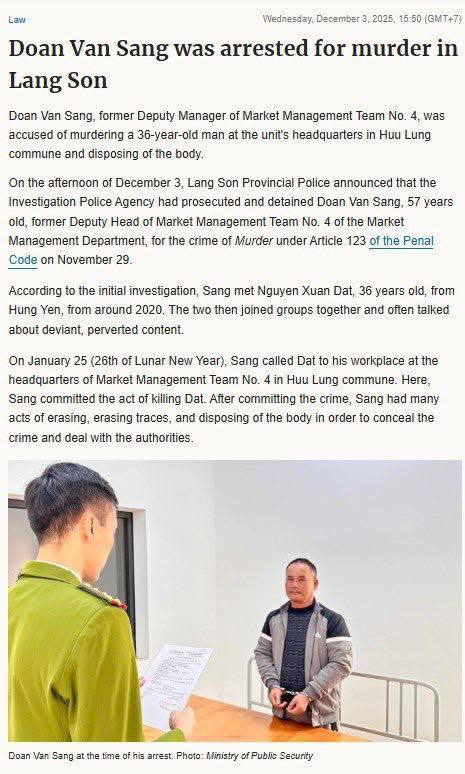 នៅរសៀលថ្ងៃទី ៣ ខែធ្នូ នគរបាលខេត្ត Lang Son បានប្រកាសថា ទីភ្នាក់ងារនគរបាលស៊ើបអង្កេតបានចោទប្រកាន់ និងឃុំខ្លួនលោក Doan Van Sang អាយុ ៥៧ ឆ្នាំ អតីតអនុប្រធានក្រុមគ្រប់គ្រងទីផ្សារលេខ ៤ នៃនាយកដ្ឋានគ្រប់គ្រងទីផ្សារ ពីបទឃាតកម្មក្រោមមាត្រា ១២៣ នៃក្រមព្រហ្មទណ្ឌនៅថ្ងៃទី ២៩ ខែវិច្ឆិកា។