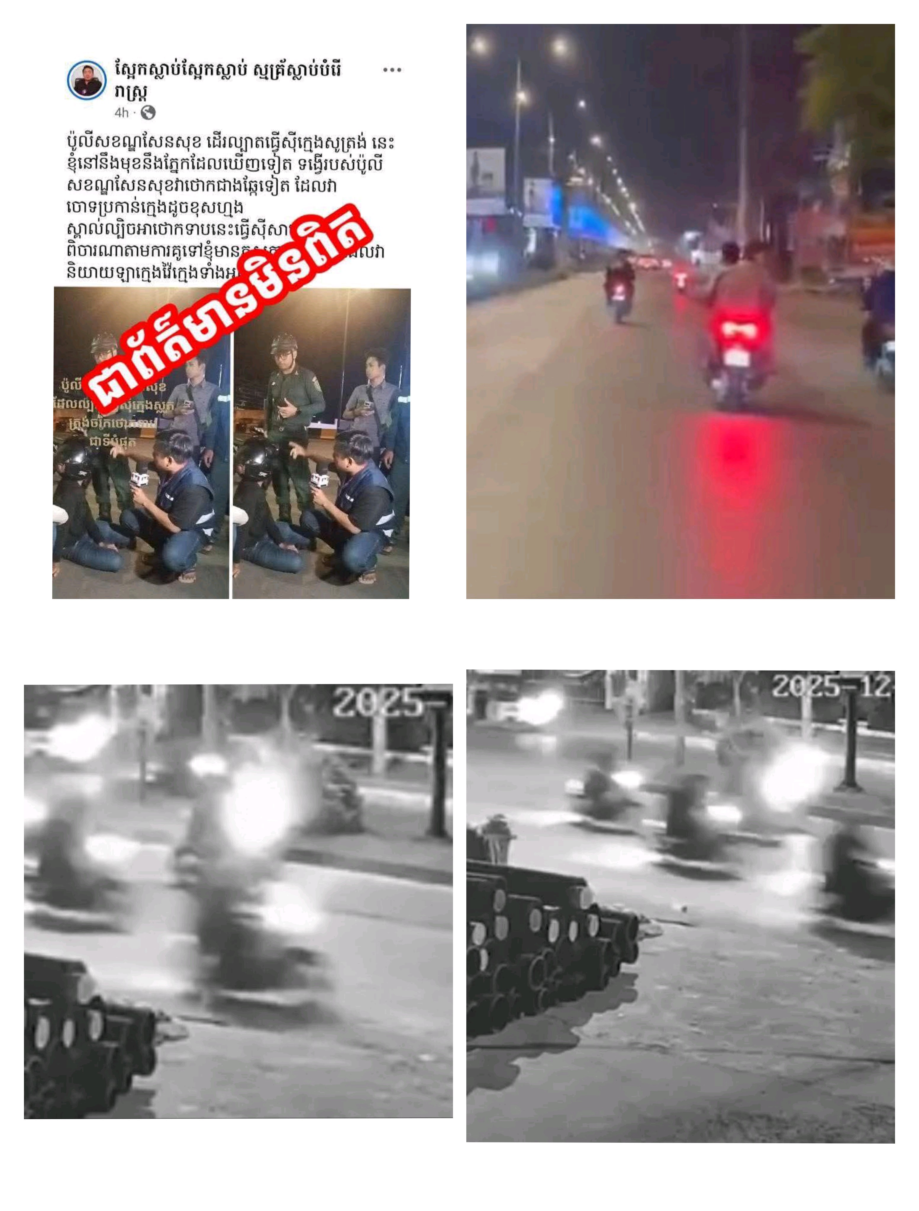 ភ្នំពេញ÷ នៅថ្ងៃទី០៧ ខែធ្នូ ឆ្នាំ២០២៥ នៅវេលាម៉ោងប្រហែល១២នឹង០០នាទីយប់កណ្តាលអធ្រាត្រ កម្លាំងអធិការដ្ឋាននគរបាលខណ្ឌសែនសុខបានធ្វេីការល្បាតការពារសន្តិសុខ ដើម្បីបង្ការបង្រ្កាបបទល្មេីស លួច ឆក់ ប្លន់ និងក្មេងទំនើង នៅក្នុងមូលដ្ឋាន ខណ្ឌសែនសុខ។ លុះរហូតដល់ម៉ោងប្រហែល១នឹង១០នាទីយប់អធ្រាត្រក៏បានជួបក្មេងទំនើង២ក្រុមជិះម៉ូតូប្រហែល៣០គ្រឿង បានធ្វេីការបង្ហោះម៉ូតូ និងជិះប្រដេញគ្នាប្រសេចប្រសាចពេញផ្លូវ នៅចំណុចខាងមុខធនាគារជាតិ ផ្លូវហាណូយសង្កាត់ភ្នំេពញថ្មីខណ្ឌសែនសុខ ហេីយក៏ត្រូវបានកម្លាំងនគរបាលល្បាតដេញឃាត់បានចំនួន១៣នាក់ ជាបន្ត បន្ទាប់ រួមនិងម៉ូតូ ៨គ្រឿង យកមកកាន់អធិការដ្ឋាននគរបាលខណ្ឌសែនសុខដេីម្បីសាកសួរនឹងបានធ្វេីតេស្ត រកសារធាតុញៀននៅក្នុងទឹកនោមជាលទ្ធផលអវិជ្ជមានទាំងអស់។