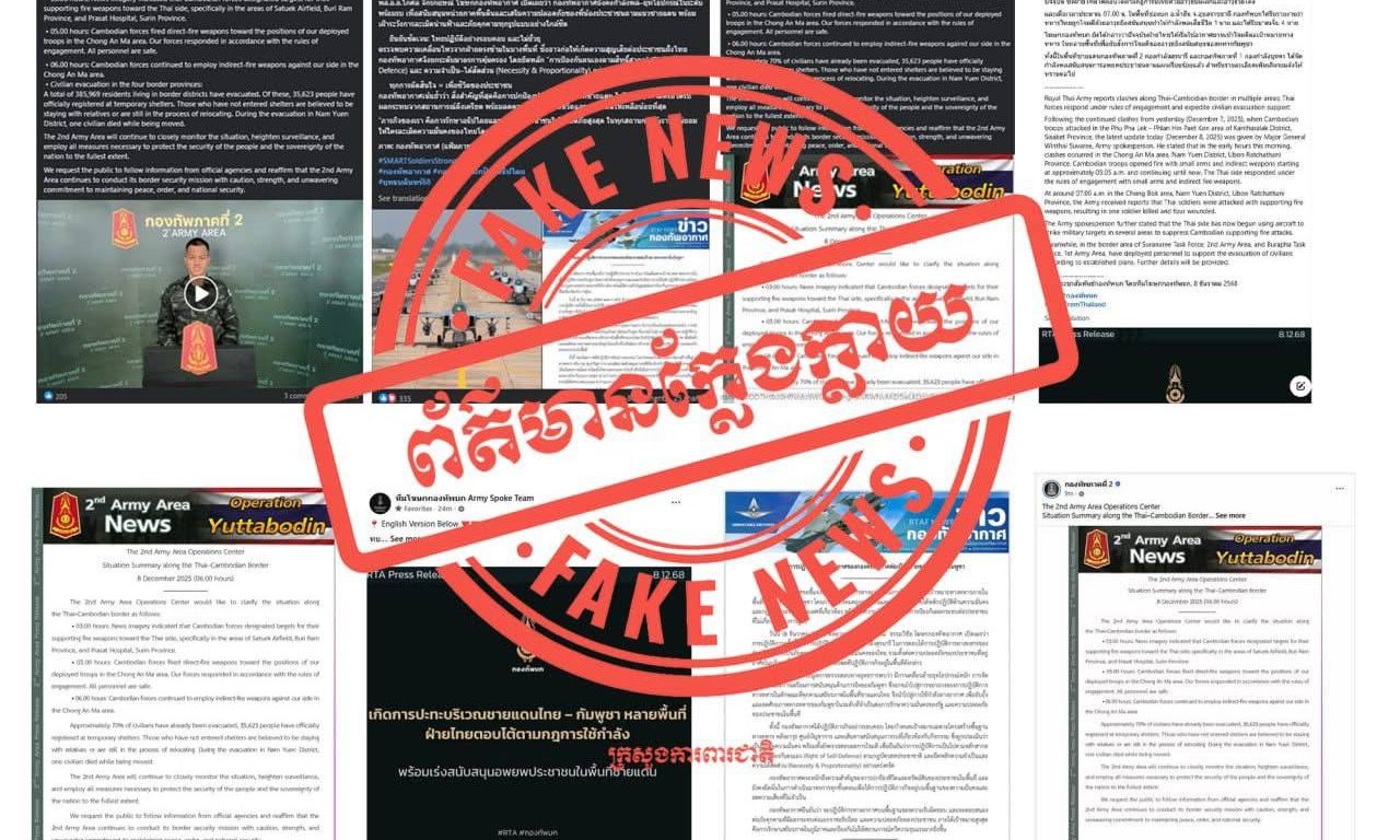 ភ្នំពេញ ៖ នៅព្រឹកថ្ងៃទី០៨ ខែធ្នូ ឆ្នាំ២០២៥នេះ ក្រសួងការពារជាតិកម្ពុជា បានច្រានចោលទាំងស្រុងចំពោះការផ្សព្វផ្សាយនៅលើផេកផ្លូវការកងទ័ពនិងបណ្តាញសារព័ត៌មានថៃមួយចំនួនថា «កម្ពុជាបើកការបាញ់មុន និងប្រើសព្វាវុធធុនធ្ងន់»។