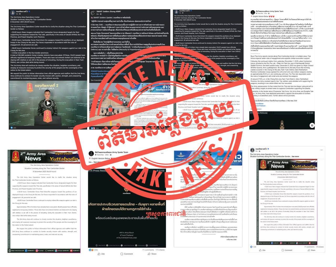 សូមបញ្ជាក់ថា ៖ តាមបណ្តាញសង្គម លោកស្រីឧត្តមសេនីយ៍ឯក ម៉ាលី សុជាតា បានលើកឡើងថា «ការលើកឡើងរបស់ផេកផ្លូវការរបស់កងទ័ពថៃ និងបណ្តាញសារព័ត៌មានថៃមួយចំនួន ដែលថា កម្ពុជាបើកការបាញ់មុន និងប្រើសព្វាវុធធុនធ្ងន់នៅតាមបណ្តោយព្រំដែនកម្ពុជា-ថៃ គឺជាព័ត៌មានមិនពិត កងកម្លាំងយោធាថៃបានចាប់ផ្តើមបើកការវាយប្រហារមកលើកងកម្លាំងយោធាកម្ពុជា នៅព្រឹកថ្ងៃទី៨ ខែធ្នូ ឆ្នាំ២០២៥ ចាប់តាំងពីម៉ោង៥ព្រឹកមក»។