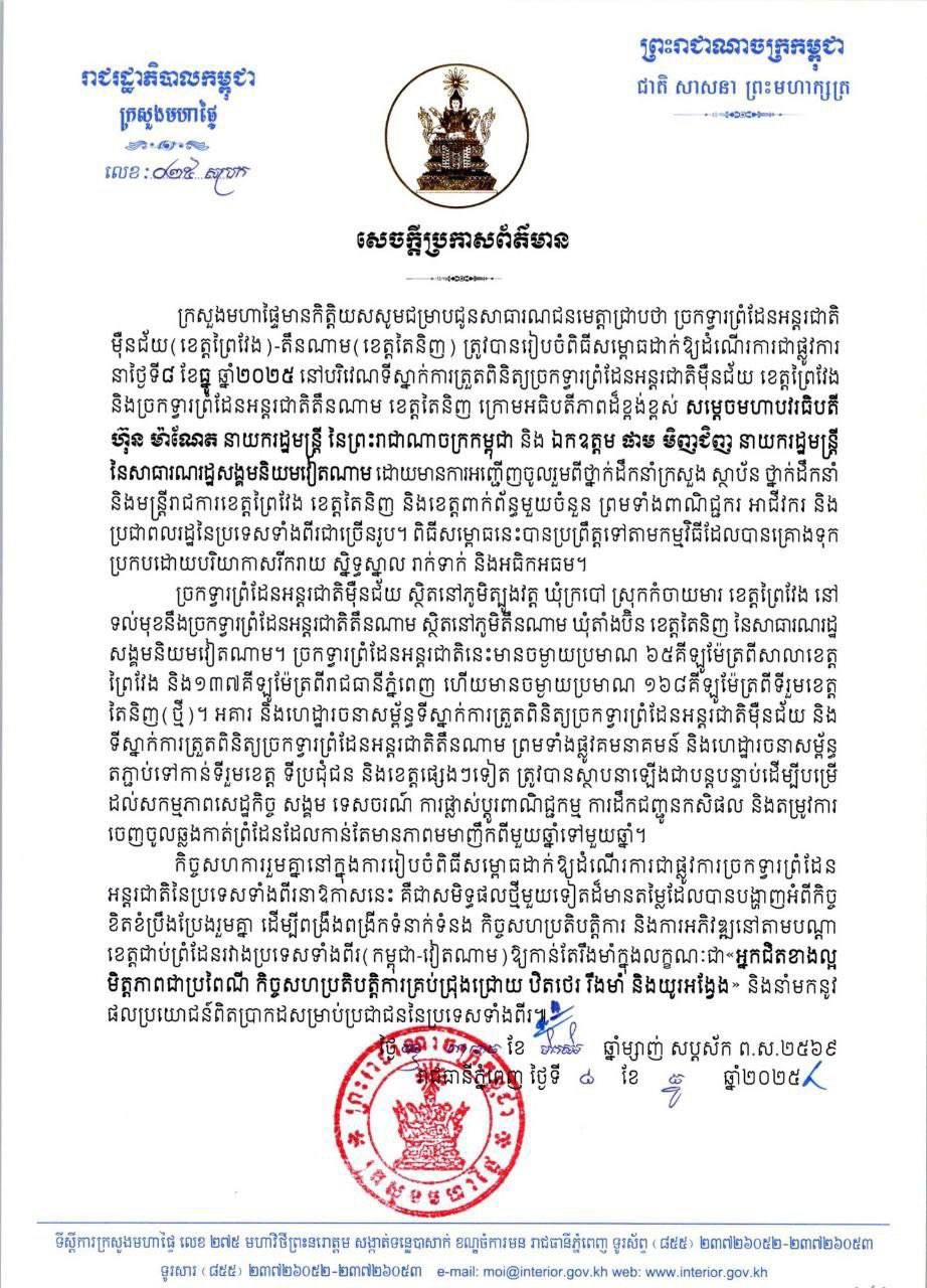 ក្រសួងមហាផ្ទៃ​ ចេញសេចក្តីប្រកាសព័ត៌មាន​ ស្តីអំពី​ការសម្ពោធដាក់ឱ្យដំណើរការជាផ្លូវការ​នូវច្រកទ្វារព្រំដែនអន្តរជាតិ ម៉ឺនជ័យ (ខេត្តព្រៃវែង)-តឹនណាម(ខេត្តតៃនិញ)
