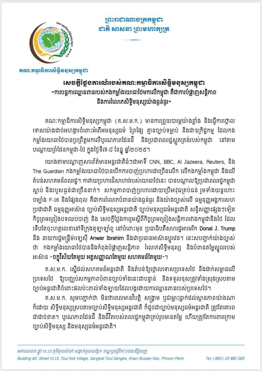 ភ្នំពេញ៖ គណៈកម្មាធិការសិទ្ធិមនុស្សកម្ពុជា (គ.ស.ម.ក.) មានការព្រួយបារម្ភយ៉ាងខ្លាំង និងធ្វើការថ្កោល ទោសយ៉ាងដាច់អហង្ការចំពោះអំពើអមនុស្សធម៌ ព្រៃផ្សៃ គ្មានច្បាប់ទម្លាប់ និងជាឧក្រិដ្ឋកម្ម ដែលកង កម្លាំងយោធាថៃបានប្រព្រឹត្តមកលើបូរណភាពដែនដី និងប្រជាពលរដ្ឋស្លូតត្រង់របស់កម្ពុជា នៅតាម បណ្តោយព្រំដែនកម្ពុជា-ថៃ ក្នុងថ្ងៃទី៧-៨ ខែធ្នូ ឆ្នាំ២០២៥។