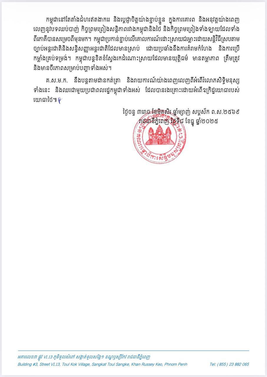 កម្ពុជានៅតែតាំងជំហរឥតងាករេ និងប្តេជ្ញាចិត្តយ៉ាងខ្ជាប់ខ្ជួន ក្នុងការគោរព និងអនុវត្តយ៉ាងពេញ លេញនូវបទឈប់បាញ់ កិច្ចព្រមព្រៀងសន្តិភាពរវាងកម្ពុជានិងថៃ និងកិច្ចព្រមព្រៀងទាំងឡាយដែលទាំង ពីរភាគីបានសម្រេចពីមុនមក។ កម្ពុជាប្រកាន់ខ្ជាប់លើគោលការណ៍ដោះស្រាយជម្លោះដោយសន្តិវិធីស្របតាម ច្បាប់អន្តរជាតិនិងសន្ធិសញ្ញាអន្តរជាតិដែលមានស្រាប់ ដោយប្រឆាំងនឹងការគំរាមកំហែង និងការប្រើ កម្លាំងគ្រប់ទម្រង់។ កម្ពុជាបន្តខិតខំស្វែងរកដំណោះស្រាយដែលមានយុត្តិធម៌ មានតម្លាភាព ត្រឹមត្រូវ និងមានចីរភាពសម្រាប់បញ្ហាទាំងអស់។