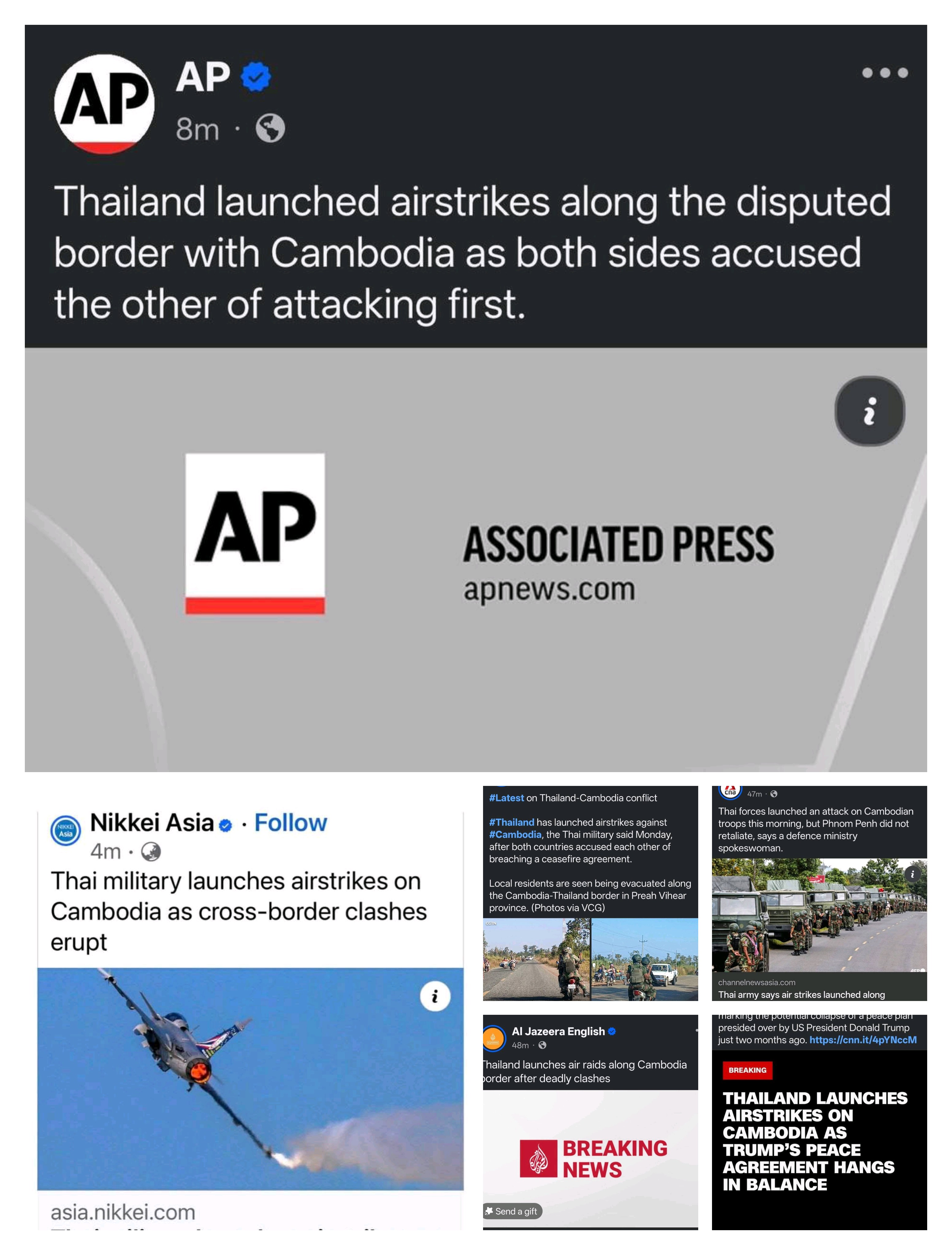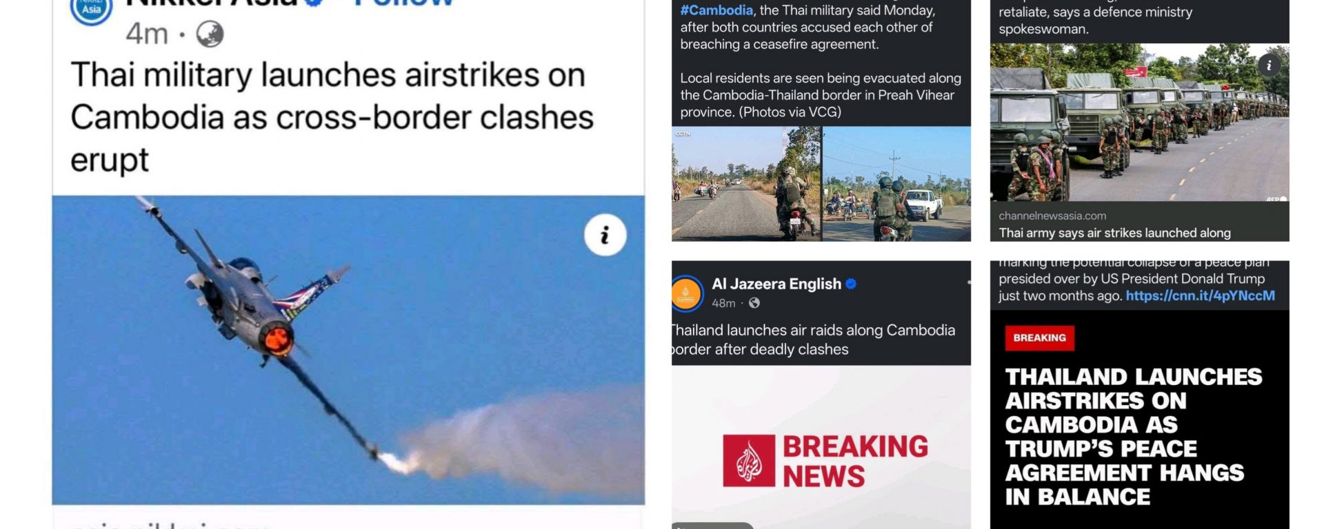 យោងតាមបណ្តាញសារព័ត៌មានអន្តរជាតិធំៗជាអាទិ៍ CNN, BBC, Al Jazeera, Reuters, និង The Guardian កងកម្លាំងយោធាថៃបានបើកការបាញ់ប្រហារជាច្រើនលើក លើកងកម្លាំងកម្ពុជា និងលើ តំបន់សហគមន៍ពលរដ្ឋ។ ការវាយប្រហារដ៏សាហាវរបស់យោធាថៃនេះ បានបណ្តាលឱ្យប្រជាពលរដ្ឋកម្ពុជា ស្លាប់ និងរបួសធ្ងន់ជាច្រើននាក់។ សកម្មភាពបាញ់ប្រហារដោយប្រើអាវុធគ្រប់ធន់ រួមទាំងយន្តហោះ ចម្បាំង F-16 និងផ្សែងពុល គឺជាការរំលោភបំពានយ៉ាងធ្ងន់ធ្ងរ និងយ៉ាងច្បាស់លើ ធម្មនុញ្ញអង្គការសហ ប្រជាជាតិ ធម្មនុញ្ញអាស៊ាន ច្បាប់សិទ្ធិមនុស្សអន្តរជាតិ ច្បាប់មនុស្សធម៌អន្តរជាតិ សន្ធិសញ្ញាផ្សេងៗទៀត កិច្ចព្រមព្រៀងបទឈប់បាញ់ និង សេចក្តីថ្លែងការរួមស្តីពីកិច្ចព្រមព្រៀងសន្តិភាពរវាងកម្ពុជានិងថៃ ដែល ទើបតែចុះហត្ថលេខានៅទីក្រុងគូឡាឡាំពួ នៅចំពោះមុខ ប្រធាធិបតីសហរដ្ឋអាមេរិក Donal J. Trump និង នាយករដ្ឋមន្ត្រីម៉ាឡេស៊ី Anwar Ibrahim និងជាប្រធានអាស៊ានប្តូរវេន។ នេះសបញ្ជាក់យ៉ាងច្បាស់ ថា កងកម្លាំងយោធាថៃបាននិងកំពុងបំផ្លាញសន្តិភាព រំលោភសិទ្ធិមនុស្ស និងបំពានតម្លៃស្នូលរបស់ អាស៊ាន «ចក្ខុវិស័យតែមួយ អត្តសញ្ញាណតែមួយ សហគមន៍តែមួយ»។