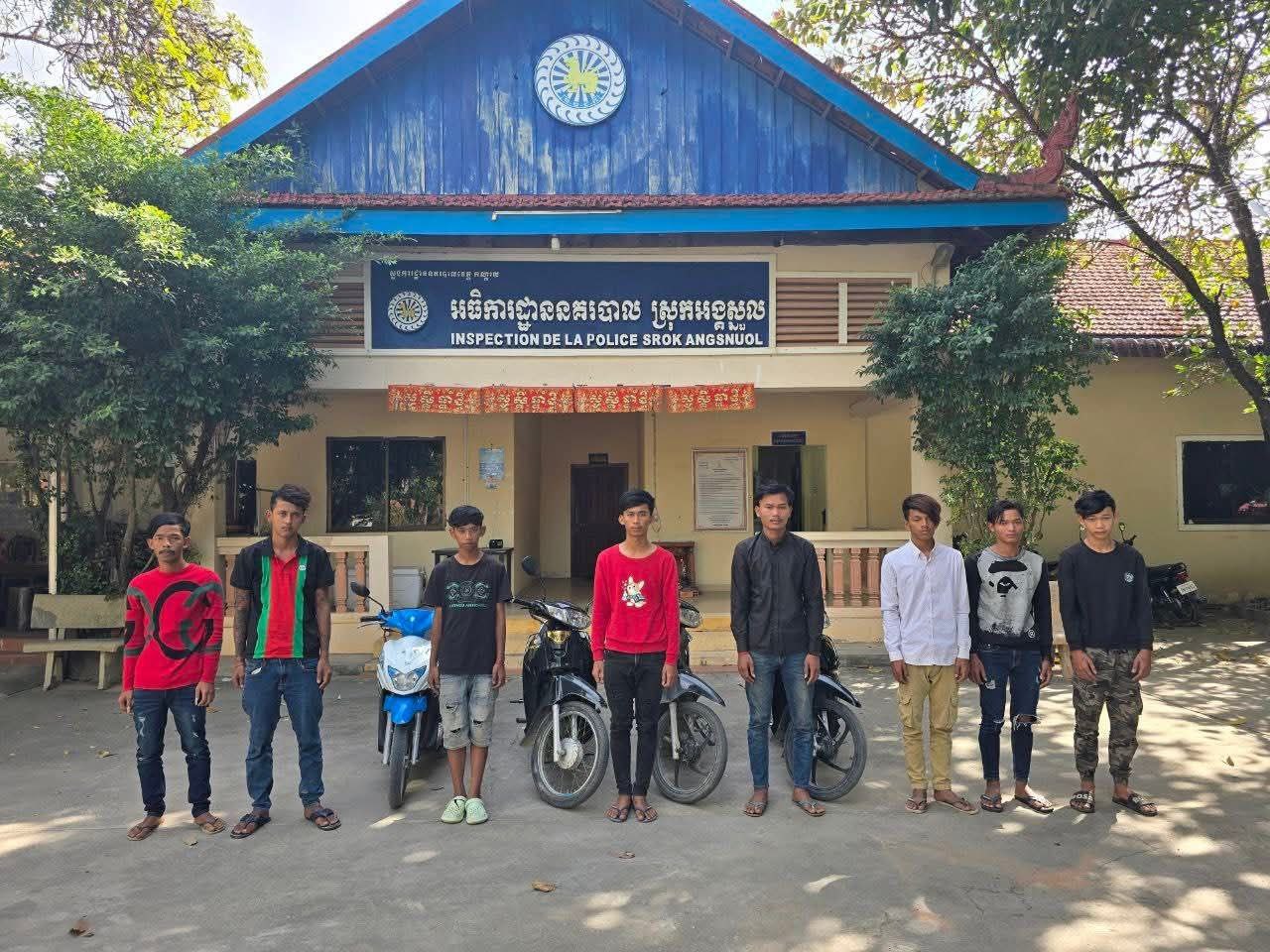 ខេត្តកណ្ដាល÷ មន្ត្រីនគរបាលនៃអធិការដ្ឋាននគរបាលស្រុកអង្គស្នួលបានឲ្យដឹងនៅព្រឹកថ្ងៃទី១០ ខែធ្នូ ឆ្នាំ 2025 នេះថា ប្រតិបត្តិការបង្ក្រាបមុខសញ្ញាក្មេងទំនើង បង្ហោះម៉ូតូដោយឃាត់ខ្លួនបានចំនួន៨នាក់។