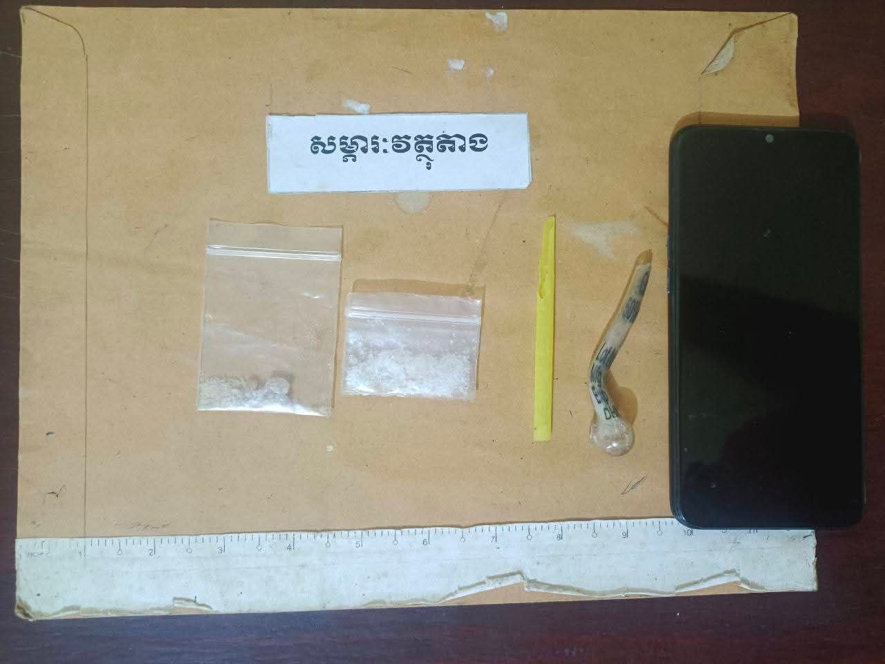 ជាក់ស្តែងកំលាំងនគរបាលបានឃាត់និងត្រួតពិនិត្យឆែកឆេរ រកឃេីញ÷ម្សៅក្រាមពណ៍សសង្ស័យជាគ្រឿង ញៀនចំនួន០២កញ្ចាប់តូច,ទូរស័ព្ទ១គ្រឿង,ទុយោកែច្នៃសម្រាប់ចូកគ្រឿងញៀន០១ និងឧបករណ៍កែឆ្នៃសម្រាប់ប្រើប្រាស់គ្រឿងញៀនមួយចំនួន។