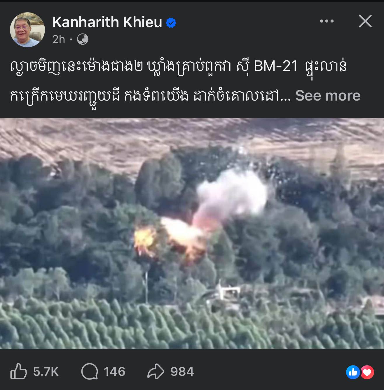 ភ្នំពេញ៖ លោក ខៀវ កាញារីទ្ធ ឧត្តមប្រឹក្សាផ្ទាល់ព្រះមហាក្សត្រ និងជាសមាជិករដ្ឋសភា បានថ្លែងនៅព្រឹកថ្ងៃចន្ទទី១៥ ខែធ្នូ ឆ្នាំ២០២៥នេះថា៖ ល្ងាចមិញនេះម៉ោងជាង២ ឃ្លាំងគ្រាប់ពួកវា សុី BM-21 ផ្ទុះលាន់កក្រើកមេឃរញ្ជួយដី កងទ័ពយើង ដាក់ចំគោលដៅល្អណាស់ ទិសតាក្របី ពួកអានេវសែងចេញបែកជា២ ទៅ៣កំណាត់រកមើលតែមិនស្គាល់ ។