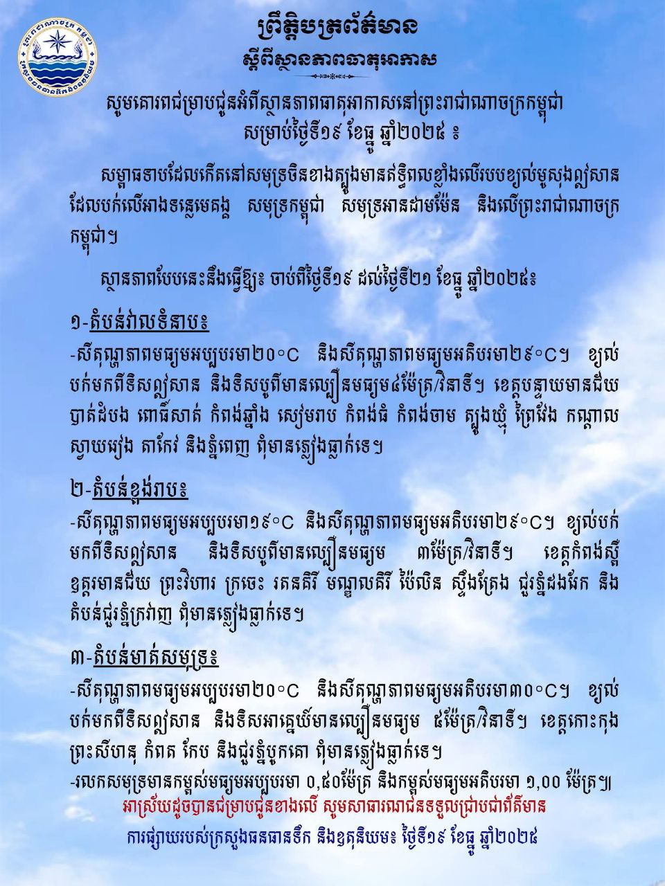 សូមគោរពជម្រាបជូនអំពីស្ថានភាពធាតុអាកាសនៅព្រះរាជាណាចក្រកម្ពុជា សម្រាប់ថ្ងៃទី១៩ ខែធ្នូ ឆ្នាំ២០២៥ ៖