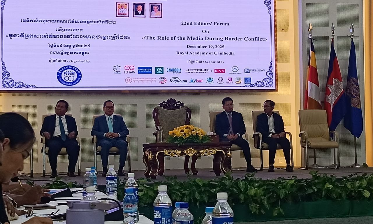 ភ្នំពេញ ៖ ក្លិបអ្នកកាសែតកម្ពុជា (ក.អ.ក) បានបើកវេទិកានិពន្ធនាយកសារព័ត៌មានកម្ពុជា ដែលជា វេទិកាប្រចាំឆ្នាំដ៏ធំបំផុតរបស់ ក.អ.កប្រារព្ធធ្វើឡើងជាលើកទី២២ ដើម្បីផ្តល់ឱកាសដល់នាយកគ្រប់គ្រង និពន្ធនាយក ឬអ្នកដឹកនាំស្ថាប័នសារព័ត៌មានទាំងកាសែត វិទ្យុ និងទូរទស្សន៍ ដើម្បីជជែកពិភាក្សាលើប្រធានបទទាក់ទង នឹងបច្ចុប្បន្នភាពនៃតួនាទីរបស់អ្នកសារព័ត៌មាននៅពេលមានជម្លោះព្រំដែន នាថ្ងៃទី១៩ ខែធ្នូ ឆ្នាំ២០២៥ នៅរាជបណ្ឌិត្យសភាកម្ពុជា។