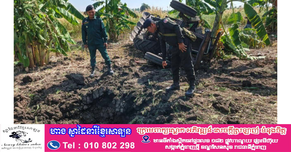 ខេត្តបាត់ដំបង៖ បុរសម្នាក់បានរងរបួសធ្ងន់ខណៈពេលកំពុងបើកត្រាក់ទ័រភ្ជួរដីចំការប៉ះត្រូវមីនតោនបណ្តាលឱ្យផ្ទុះឡើងនៅវេលាម៉ោង ១៣និង០០នាទី ថ្ងៃទី១៩ ខែធ្នូ ឆ្នាំ២០២៥ នៅត្រង់ចំណុចភូមិអន្លង់ស្តី ឃុំបូរ ស្រុកភ្នំព្រឹក ខេត្តបាត់ដំបង។