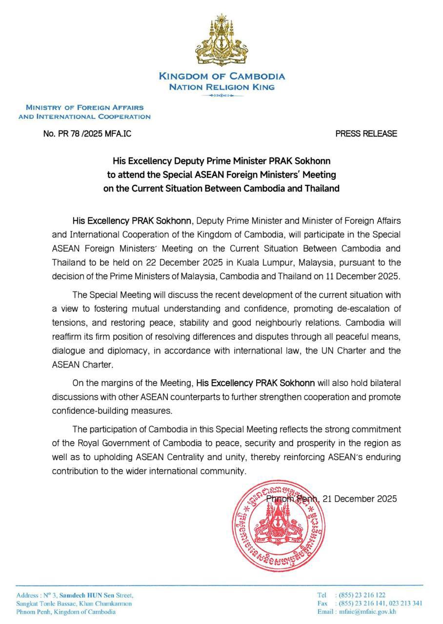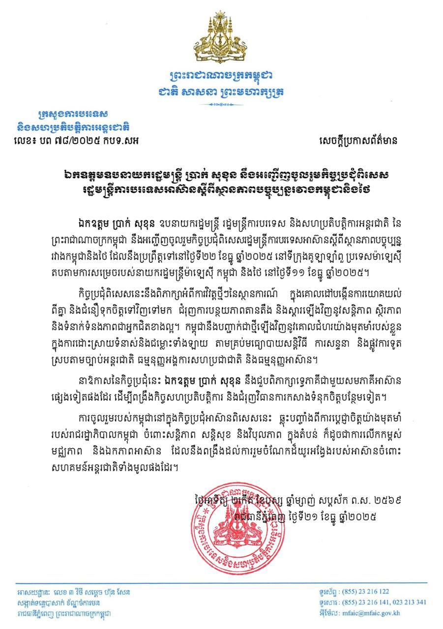 ភ្នំពេញ​៖​ លោក ប្រាក់ សុខុន ឧបនាយករដ្ឋមន្ត្រី រដ្ឋមន្ត្រីការបរទេស និងសហប្រតិបត្តិការអន្តរជាតិ នៃ ព្រះរាជាណាចក្រកម្ពុជា នឹងអញ្ជើញចូលរួមកិច្ចប្រជុំពិសេសរដ្ឋមន្ត្រីការបរទេសអាស៊ានស្តីពីស្ថានភាពបច្ចុប្បន្ន រវាងកម្ពុជានិងថៃ ដែលនឹងប្រព្រឹត្តទៅនៅថ្ងៃទី២២ ខែធ្នូ ឆ្នាំ២០២៥ នៅទីក្រុងគូឡាឡាំពួ ប្រទេសម៉ាឡេស៊ី តបតាមការសម្រេចរបស់នាយករដ្ឋមន្ត្រីម៉ាឡេស៊ី កម្ពុជា និងថៃ នៅថ្ងៃទី១១ ខែធ្នូ ឆ្នាំ២០២៥។