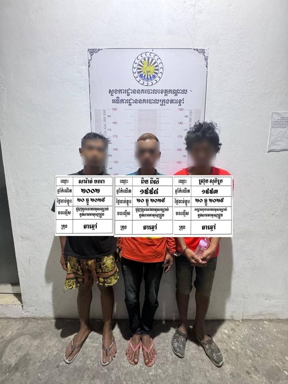 ខេត្តកណ្ដាល៖ មន្ត្រីនគរបាលនៃស្នងការដ្ឋាននគរបាលខេត្តកណ្ដាលបានឲ្យដឹងនៅព្រឹកថ្ងៃទី 22 ខែធ្នូនេះថា ជនសង្ស័យ៣នាក់ ដែលកំពុងពួនសម្ងំធ្វើសកម្មភាពជួញដូរ និងប្រើប្រាស់គ្រឿងញៀននៅរោងចាំចម្ការមួយកន្លែង ត្រូវបានកម្លាំងសមត្ថកិច្ចចុះឆ្មក់បង្ក្រាប និងឃាត់ខ្លួនបានភ្លាមៗ ក្រោយទទួលសេចក្ដីរាយការណ៍ពីពលរដ្ឋល្អ។ ប្រតិបត្តិការនេះបានធ្វើឡើងនៅវេលាម៉ោង ២១និង៤០នាទី យប់ថ្ងៃទី២០ ធ្នូ ២០២៥ ត្រង់ចំណុចភូមិសិត្បូ សង្កាត់សិត្បូ ក្រុងតាខ្មៅ ខេត្តកណ្តាល។