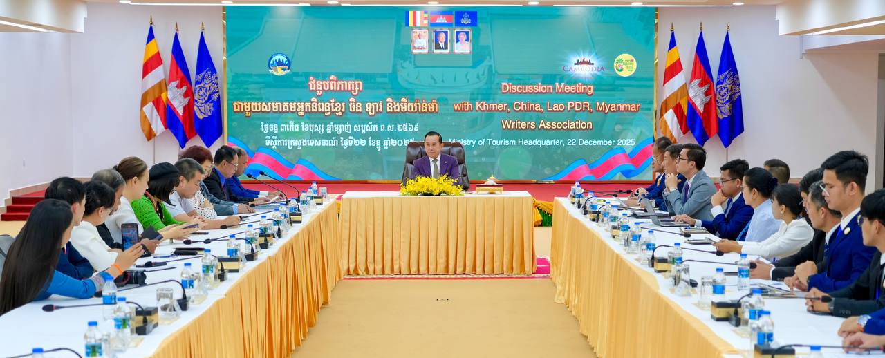 ភ្នំពេញ៖ លោក ហួត ហាក់ រដ្ឋមន្ត្រីក្រសួងទេសចរណ៍ រួមជាមួយថ្នាក់ដឹកនាំក្រសួង ទីស្តីការក្រសួងទេសចរណ៍ បានអញ្ជើញជាអធិបតីក្នុងជំនួបពិភាក្សាជាមួយសមាគមអ្នកនិពន្ធខ្មែរ ចិន ឡាវ និងមីយ៉ាន់ម៉ា កាលពីថ្ងៃទី២២ ខែធ្នូ ឆ្នាំ២០២៥ម្សិលមិញនេះ ដែលដឹកនាំដោយ លោក ព្រឿង ប្រណីត ប្រធានសមាគមអ្នកនិពន្ធខ្មែរ, លោកស្រី JIANG JINLU អនុប្រធានសមាគមអ្នកនិពន្ធចិន, លោក THONBAY PHOTHISANE ប្រធានសមាគមអ្នកនិពន្ធឡាវ និងលោក OHN MAUNG ប្រធានសមាគមអ្នកនិពន្ធមីយ៉ាន់ម៉ា ព្រមទាំងអមដោយ សមាជិក សមាជិកនៃសមាគមអ្នកនិពន្ធខ្មែរ ចិន ឡាវ និងមីយ៉ាន់ម៉ា ចំនួន ២៥នាក់ ដើម្បីគោរពស្នើសុំអនុសាសន៍ក្នុងការលើកកម្ពស់កិច្ចសហប្រតិបត្តិការវិស័យទេសចរណ៍កម្ពុជា និងសិក្សាឈ្វេងយល់កាន់តែស៊ីជម្រៅ និងសហការចូលរួមផ្សព្វផ្សាយវិស័យទេសចរណ៍កម្ពុជាឱ្យកាន់តែផុលផុសបន្ថែមទៀត។
