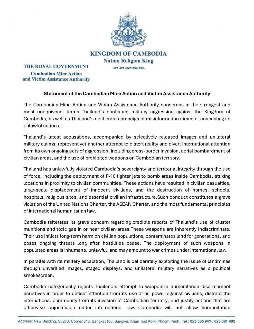 អាជ្ញាធរមីនកម្ពុជា ចេញសេចក្តីថ្លែងការណ៍​ឆ្លើយតបចំពោះ​ចេតនាបំភាន់ការពិតរបស់ថៃ​ និងការ​​បង្វែរការចាប់អារម្មណ៍​អន្តរជាតិពីការ​ឈ្លានពានដែលកំពុងបន្តរបស់ថៃ​ ដោយរួមទាំងការ​ទម្លាក់គ្រាប់បែកក្នុងតំបន់ស៊ីវិល និងការ​ប្រើប្រាស់សព្វាវុធខុសច្បាប់មកលើកម្ពុជា