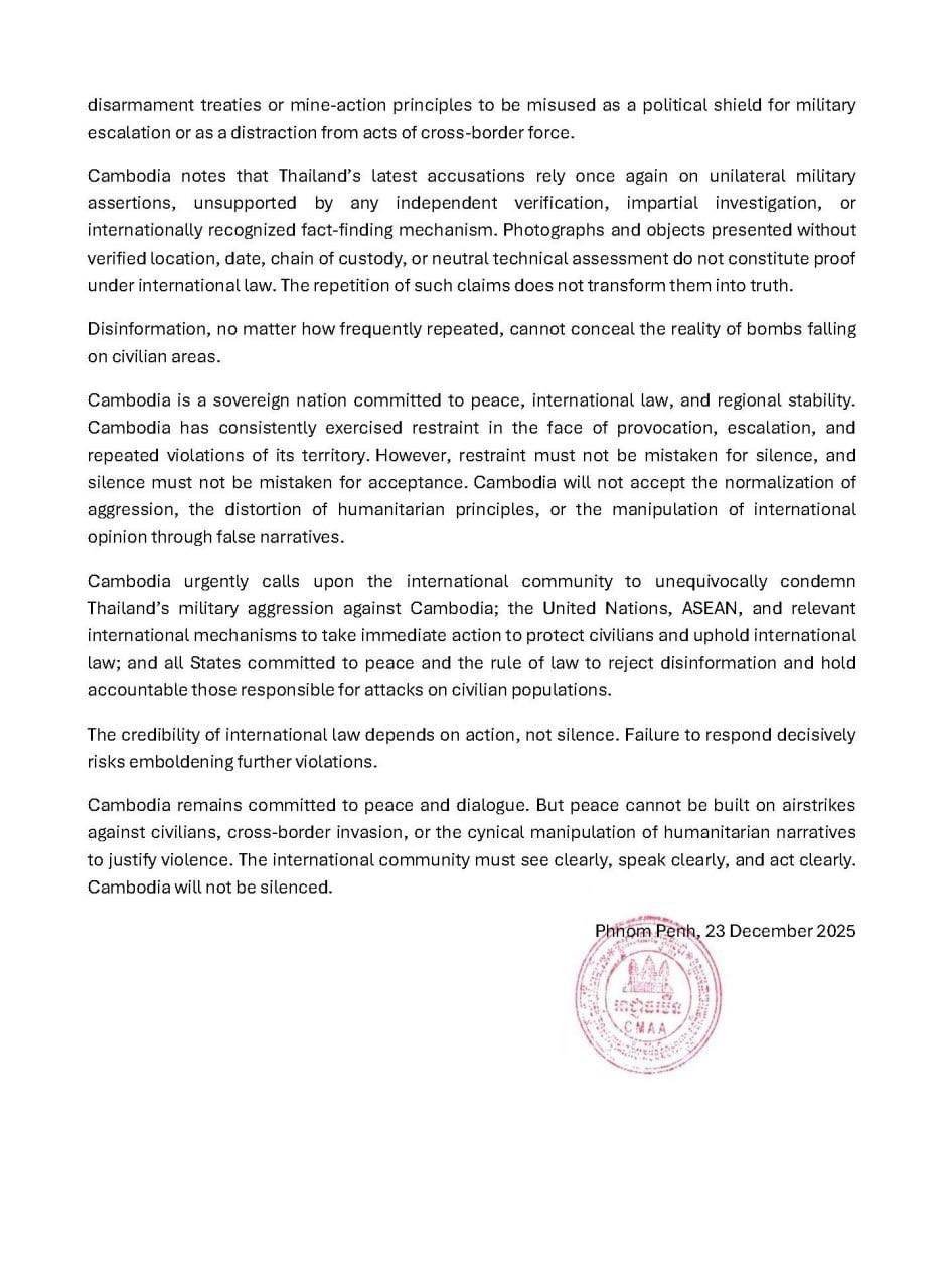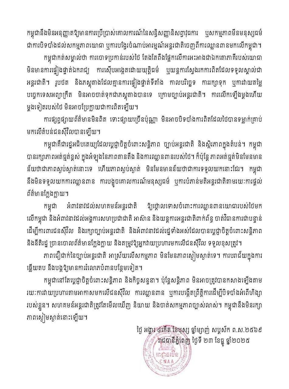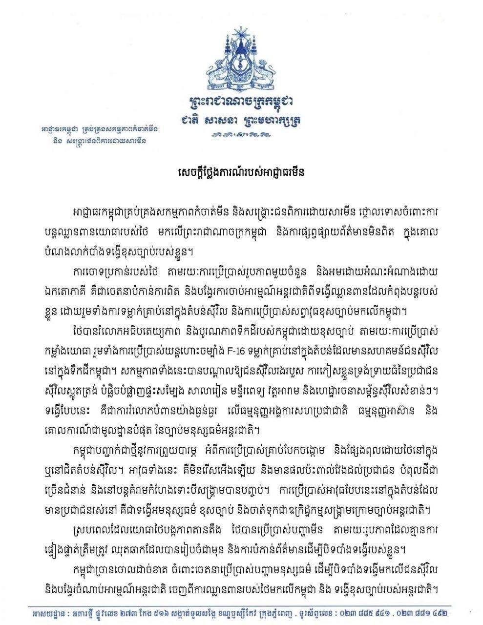 កម្ពុជា អំពាវនាវដល់សហគមន៍អន្តរជាតិ ឱ្យថ្កោលទោសចំពោះការឈ្លានពានយោធារបស់ថៃមក លើកម្ពុជា និងអំពាវនាវដល់អង្គការសហប្រជាជាតិ អាស៊ាន និងយន្តការអន្តរជាតិពាក់ព័ន្ធ ចាត់វិធានការជាបន្ទាន់ ដើម្បីការពារជនស៊ីវិល និងរក្សាច្បាប់អន្តរជាតិ និងអំពាវនាវដល់រដ្ឋទាំងអស់ដែលបានប្តេជ្ញាចិត្តចំពោះសន្តិភាព និងនីតិរដ្ឋ ច្រានចោលព័ត៌មានក្លែងក្លាយ និងតម្រូវឱ្យអ្នកវាយប្រហារមកលើជនស៊ីវិល ទទួលខុសត្រូវ។