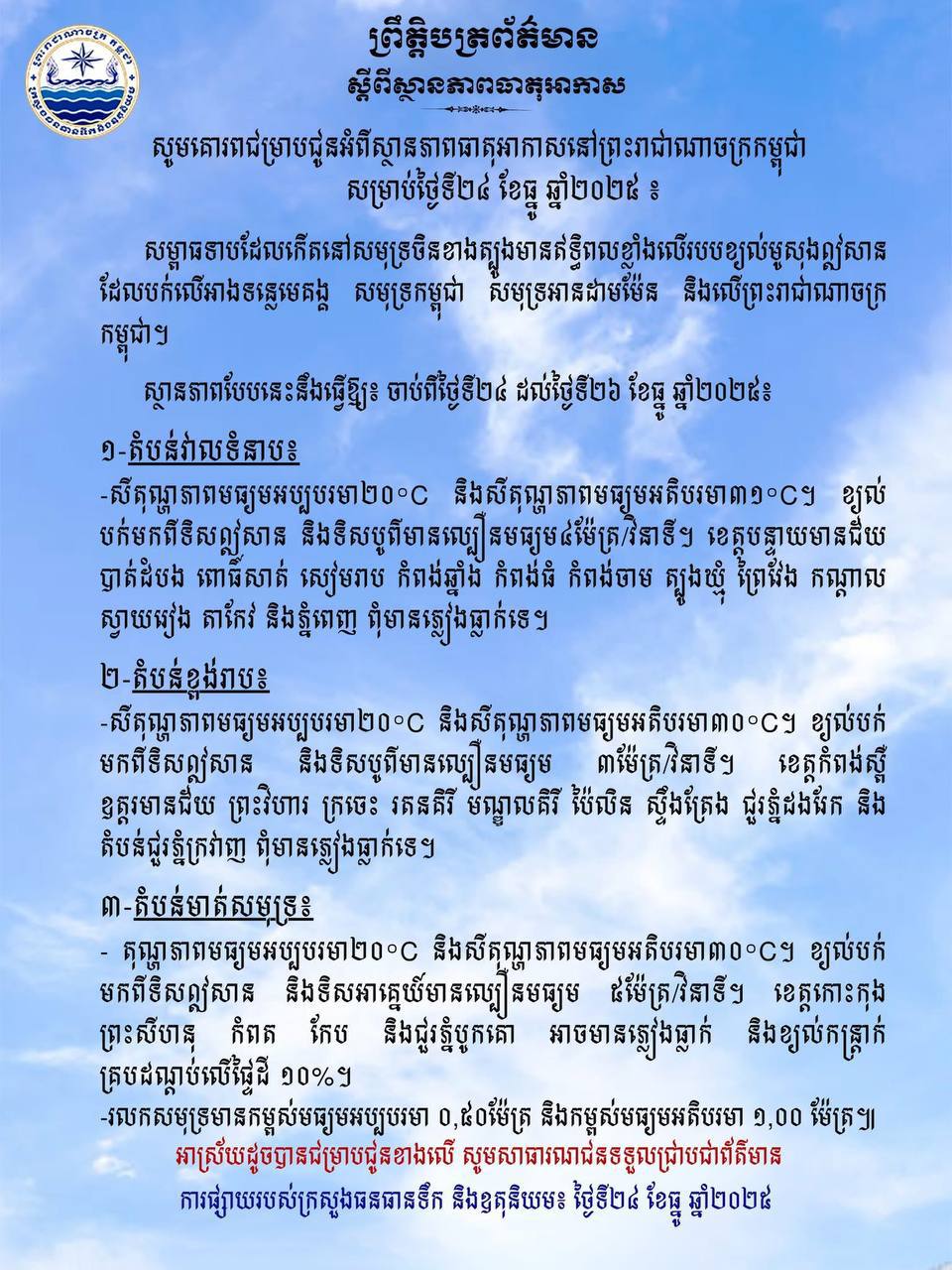 ភ្នំពេញ៖ ក្រសួងធនធានទឹក និងឧតុនិយម នៅព្រឹកថ្ងៃទី២៤ ខែធ្នូ ឆ្នាំ២០២៥នេះ បានចេញសេចក្ដីជូនដំណឹងស្តីពីស្ថានភាពធាតុអាកាសនៅព្រះរាជាណាចក្រកម្ពុជា ខណៈសម្ពាធទាបដែលកើតនៅសមុទ្រចិនខាងត្បូងមានឥទ្ធិពលខ្លាំងលើរបបខ្យល់មូសុងឦសាន ដែលបក់លើអាងទន្លេមេគង្គ សមុទ្រកម្ពុជា សមុទ្រអានដាមម៉ែន និងលើព្រះរាជាណាចក្រ កម្ពុជា។