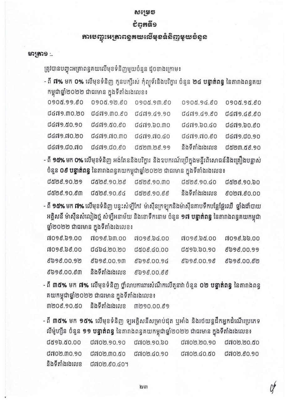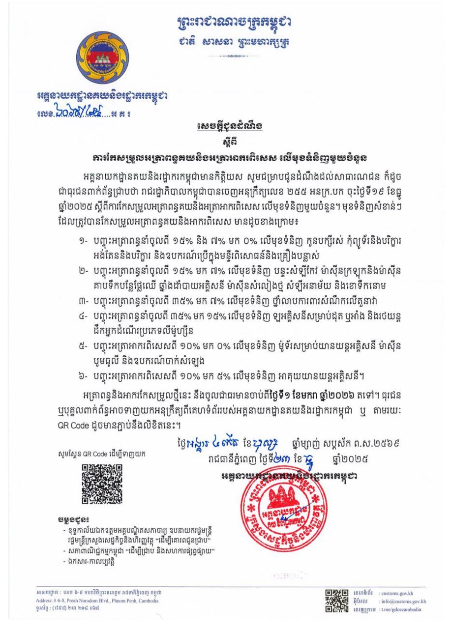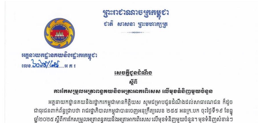 ភ្នំពេញ ៖ រាជរដ្ឋាភិបាលកម្ពុជា បានចេញអនុក្រឹត្យថ្មីមួយ ដោយសម្រេចកែសម្រួលអត្រាពន្ធគយ និងអត្រាអាករពិសេស លើមុខទំនិញមួយចំនួន នេះបើយោងតាម សេចក្ដីជូនដំណឹង អគ្គនាយកដ្ឋានគយនិងរដ្ឋាករកម្ពុជា នៅថ្ងៃទី២៣ ខែធ្នូ ឆ្នាំ២០២៥ ។ មុខទំនិញសំខាន់ៗដែលត្រូវបានកែ សម្រួលអត្រាពន្ធគយនិងអាករពិសេស មានដូចខាងក្រោម ៖ 1- បញ្ចុះអត្រាពន្ធនាំចូលពី ១៥% និង ៧% មក ០% លើមុខទំនិញ កូនបក្សីរស់ កុំព្យូទ័រនិងបរិក្ខារ អង់តែននិងបរិក្ខារ និងឧបករណ៍ប្រើក្នុងមន្ទីរពិសោធន៍និងគ្រឿងបន្លាស់ ។