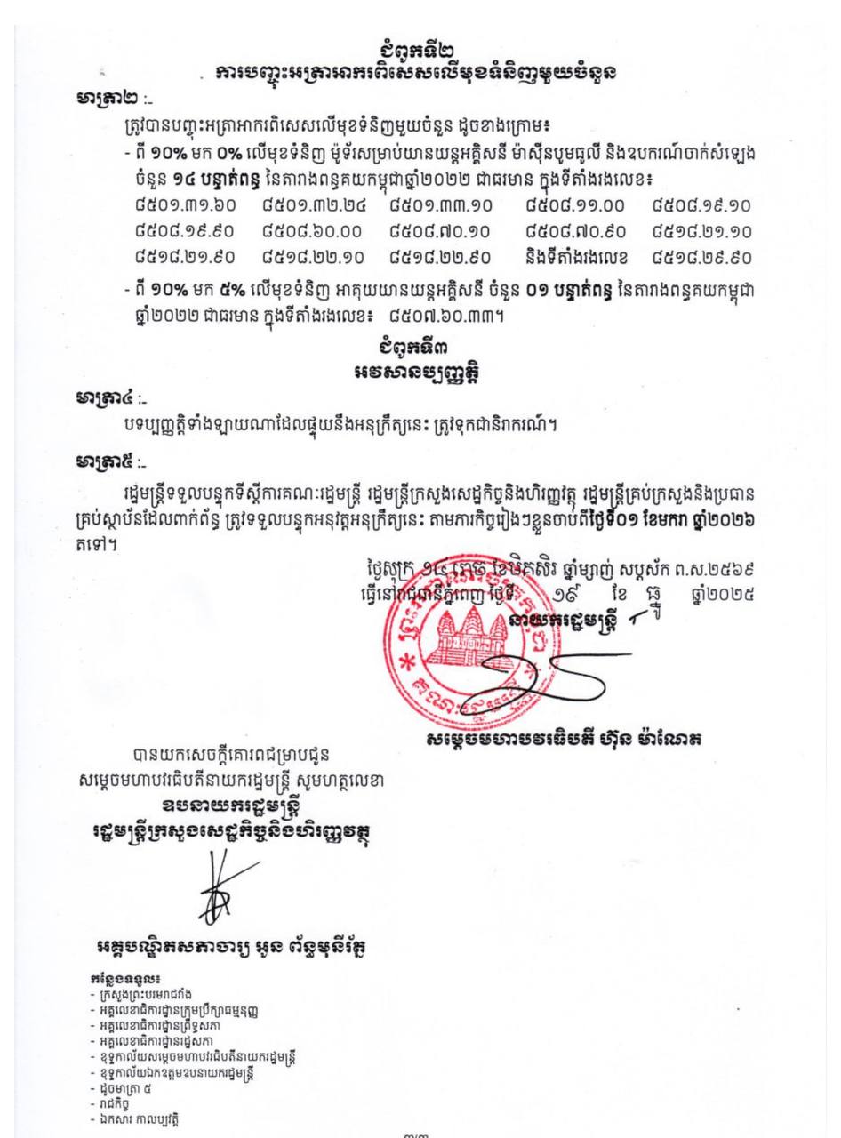 2- បញ្ចុះអត្រាពន្ធនាំចូលពី ១៥% មក ៧% លើមុខទំនិញ បន្ទះសំឡីកែវ ម៉ាស៊ីនក្រឡុកនិងម៉ាស៊ីនគាបទឹកបន្លែផ្លែឈើ ឆ្នាំងដាំបាយអគ្គិសនី ម៉ាស៊ីនសំលៀងថ្ម សំឡីអនាម័យ និងខោទឹកនោម ។ 3- បញ្ចុះអត្រាពន្ធនាំចូលពី ៣៥% មក ៧% លើមុខទំនិញ ថ្នាំលាបការពារសំណឹកលើតួនាវា ។ 4- បញ្ចុះអត្រាពន្ធនាំចូលពី ៣៥% មក ១៥% លើមុខទំនិញ ឡអគ្គិសនីសម្រាប់ដុត ឬអាំង និងរថយន្តដឹកអ្នកដំណើរប្រភេទលីម៉ូហ្សីន ។ 5- បញ្ចុះអត្រាអាករពិសេសពី ១០% មក ០% លើមុខទំនិញ ម៉ូទ័រសម្រាប់យានយន្តអគ្គិសនី ម៉ាស៊ីនបូមធូលី និងឧបករណ៍ចាក់សំឡេង ។ 6- បញ្ចុះអត្រាអាករពិសេសពី ១០% មក ៥% លើមុខទំនិញ អាគុយយានយន្តអគ្គិសនី។ អត្រាពន្ធនិងអាករកែសម្រួលថ្មីនេះ នឹងចូលជាធរមានចាប់ពីថ្ងៃទី១ ខែមករា ឆ្នាំ២០២៦ តទៅ៕ ដោយ សំរិត