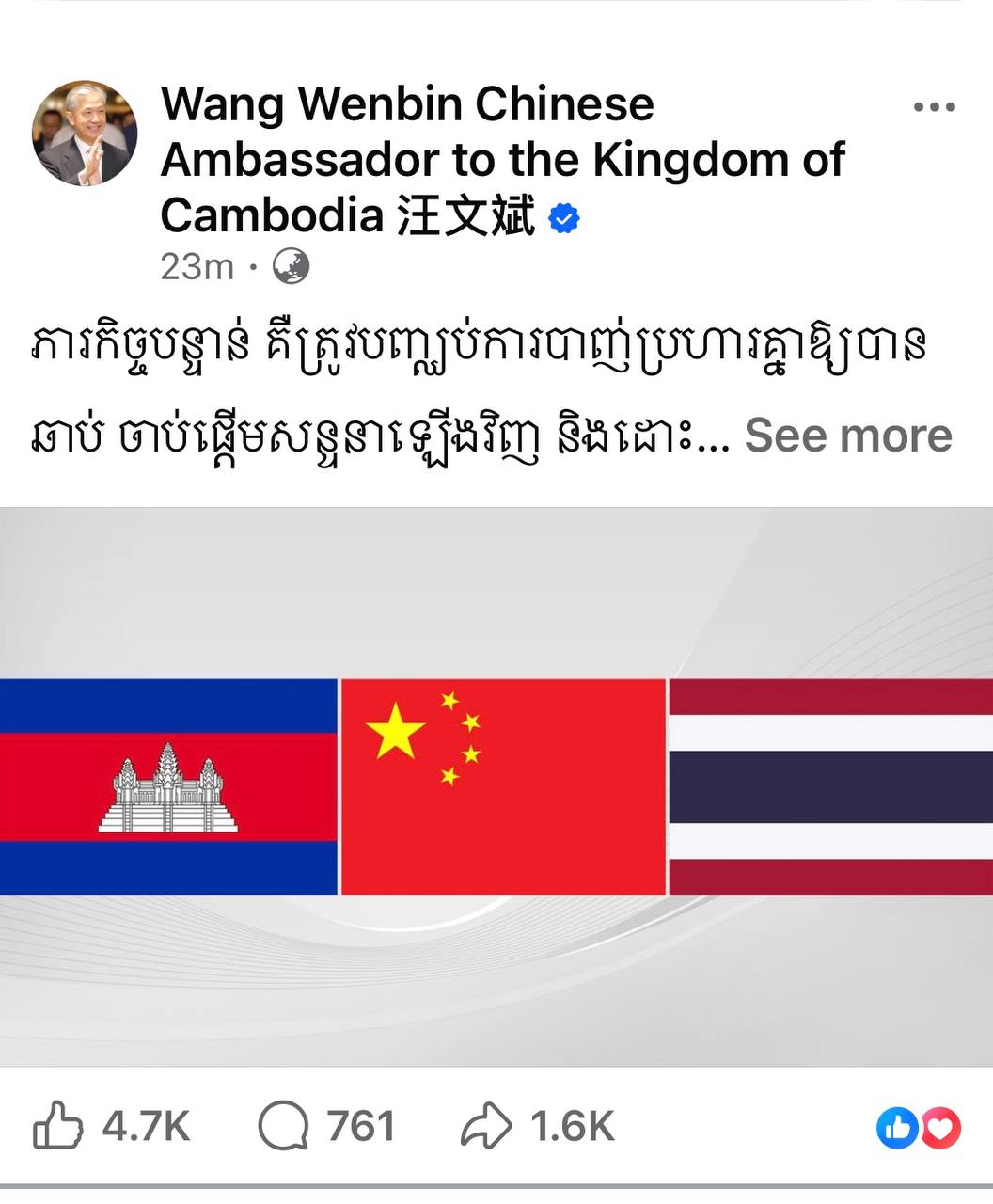 ភ្នំពេញ ៖ ជាសំណេររបស់លោកឯកអគ្គរដ្ឋទូតចិន ប្រចាំកម្ពុជា វ៉ាង វិនពីង នៅលើហ្វេសប៊ុក ផ្លូវការរបស់ខ្លួនបានលើកឡើងថា ៖ «ភារកិច្ចបន្ទាន់ គឺត្រូវបញ្ឈប់ការបាញ់ប្រហារគ្នាឱ្យបានឆាប់