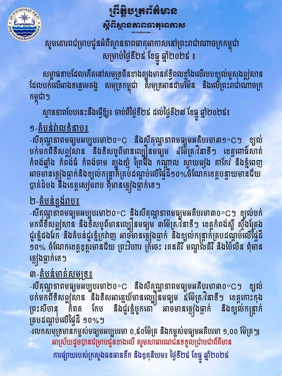 ភ្នំពេញ​៖​ ក្រសួងធនធានទឹក​ និង​ឧតុនិយម​ នៅព្រឹក​ថ្ងៃ​ទី​២៥​ ខែធ្នូ​ ឆ្នាំ​២០២៥នេះ​ បានចេញសេចក្ដីជូនដំណឹង​ស្តីពីស្ថានភាពធាតុអាកាសនៅព្រះរាជាណាចក្រកម្ពុជា ខណៈ​សម្ពាធទាបដែលកើតនៅសមុទ្រចិនខាងត្បូងមានឥទ្ធិពលខ្លាំងលើរបបខ្យល់មូសុងឦសាន ដែលបក់លើអាងទន្លេមេគង្គ សមុទ្រកម្ពុជា សមុទ្រអានជាមម៉ែន និងលើព្រះរាជាណាចក្រ កម្ពុជា។