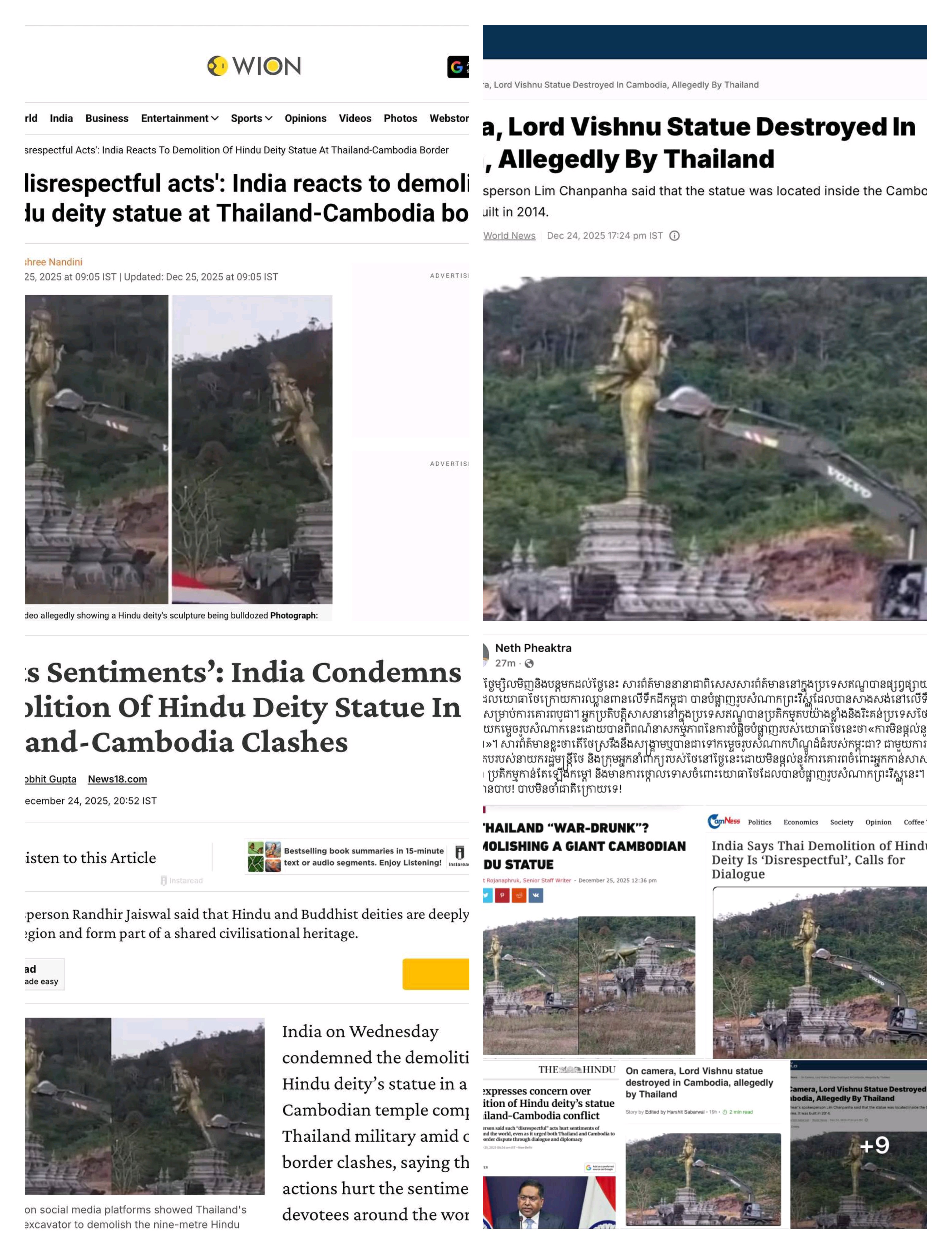 សារព័ត៌មានខ្លះថាតើថៃស្រវឹងនឹងសង្គ្រាម ឬបានជាទៅកម្ទេចរូបសំណាកហិណ្ឌូដ៏ធំរបស់កម្ពុជា? ជាមួយការឆ្លើយតបរបស់នាយករដ្ឋមន្ត្រីថៃ និងក្រុមអ្នកនាំពាក្យរបស់ថៃនៅថ្ងៃនេះដោយមិនផ្តល់នូវការគោរពចំពោះអ្នកកាន់សាសនាហិណ្ឌូ ប្រតិកម្មកាន់តែឡើងកម្តៅ និងមានការថ្កោលទោសចំពោះយោធាថៃដែលបានបំផ្លាញរូបសំណាកព្រះវិស្ណុនេះ។ ធ្វើបាបបានបាប! បាបមិនចាំជាតិក្រោយទេ!