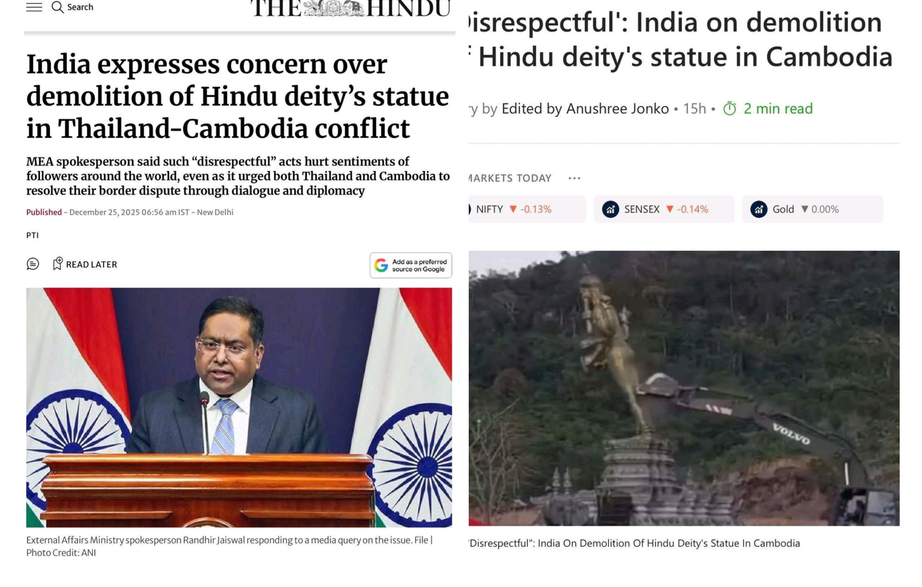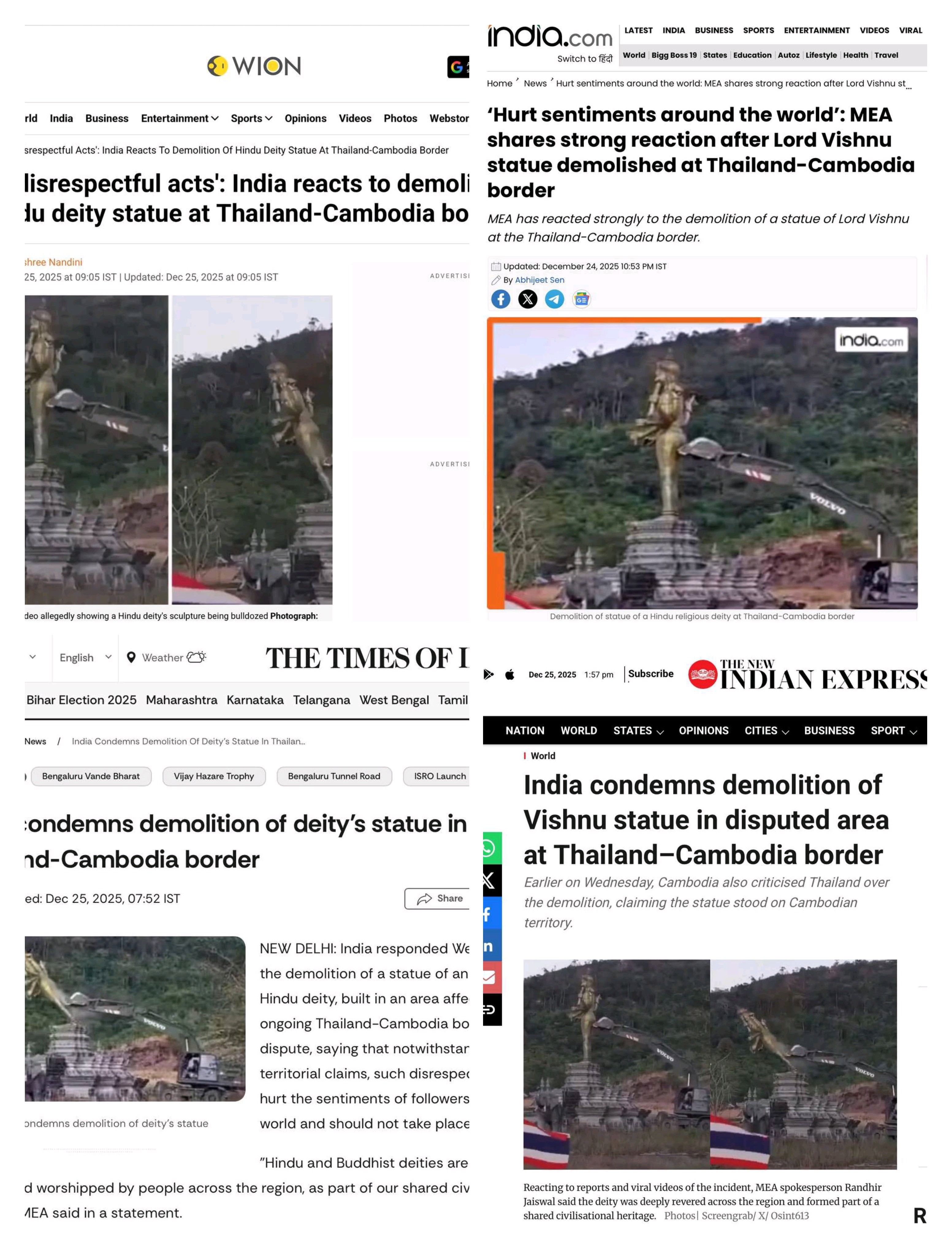 គួរឱ្យដឹងថា ក្រសួងការបរទេសឥណ្ឌា កាលពីថ្ងៃពុធ ទី២៤ ខែធ្នូ បានថ្កោលទោសដោយបានចាត់ទុកថា ការបំផិ្លចបំផ្លាញរូបសំណាកព្រះនៃសាសនាហិណ្ឌូនៅឯតំបន់ព្រំដែនកម្ពុជា-ថៃ ពីសំណាក់យោធាថៃ ជាទង្វើដែលគ្មានការគោរពទាល់តែសោះ។
