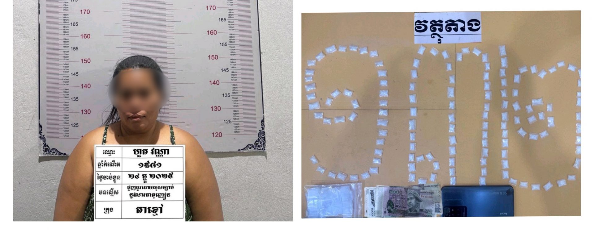 មន្ត្រីនគរបាលក្រុងតាខ្មៅបានឲ្យដឹងថា ជនសង្ស័យមាន ឈ្មោះ ហួត វណ្ណា ភេទស្រី អាយុ៤៥ឆ្នាំ ជនជាតិខ្មែរ រស់នៅភូមិថ្មី សង្កាត់តាខ្មៅ ក្រុងតាខ្មៅ ខេត្តកណ្តាល មុខរបរៈកម្មករ អវិជ្ជមាន(-) ជនសង្ស័យធ្លាប់ជាប់ពន្ធនាគារចំនួន០១លើក ជាប់រយៈពេល០២ឆ្នាំ ពីបទ ជួញដូរដោយខុសច្បាប់នូវសារធាតុញៀន។ វត្ថុតាងចាប់យក ថ្នាំញៀន(ម៉ាទឹកកក)ចំនួន១៣២កញ្ចប់ទម្ងន់២៤,៨២ក្រាមទូរស័ព្ទដៃម៉ាក Redmi ពណ៌ទឹកខ្មៅចំនួន០១គ្រឿង លុយខ្មែរចំនួន៨៥,០០០៛(ប្រាំបីម៉ឺនប្រាំពាន់រៀល) និងសម្ភារៈវេចខ្ចប់មួយចំនួន។