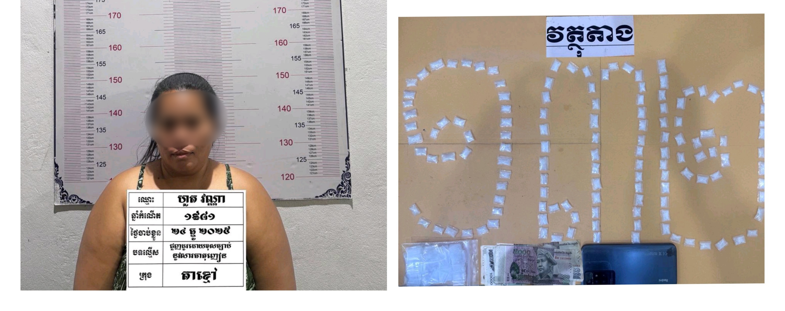 ខេត្តកណ្ដាល៖ នគរបាលក្រុងតាខ្មៅឃាត់ខ្លួនស្រ្តីជួញដូរថ្នាំញៀនយ៉ាងសកម្មម្នាក់ និងដកហូតវត្ថុតាថ្នាំញៀនចំនួន១៣២កញ្ចប់ នៅថ្ងៃទី២៤ ខែធ្នូ ឆ្នាំ២០២៥ ចំណុចផ្ទះបាក់បែកមួយកន្លែង ស្ថិតនៅភូមិថ្មី សង្កាត់តាខ្មៅ ក្រុងតាខ្មៅ ខេត្តកណ្តាល។