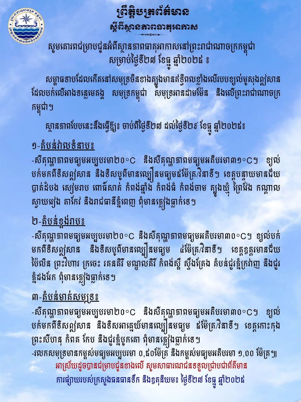 សូមគោរពជម្រាបជូនអំពីស្ថានភាពធាតុអាកាសនៅព្រះរាជាណាចក្រកម្ពុជា សម្រាប់ថ្ងៃទី២៧ ខែធ្នូ ឆ្នាំ២០២៥ ៖