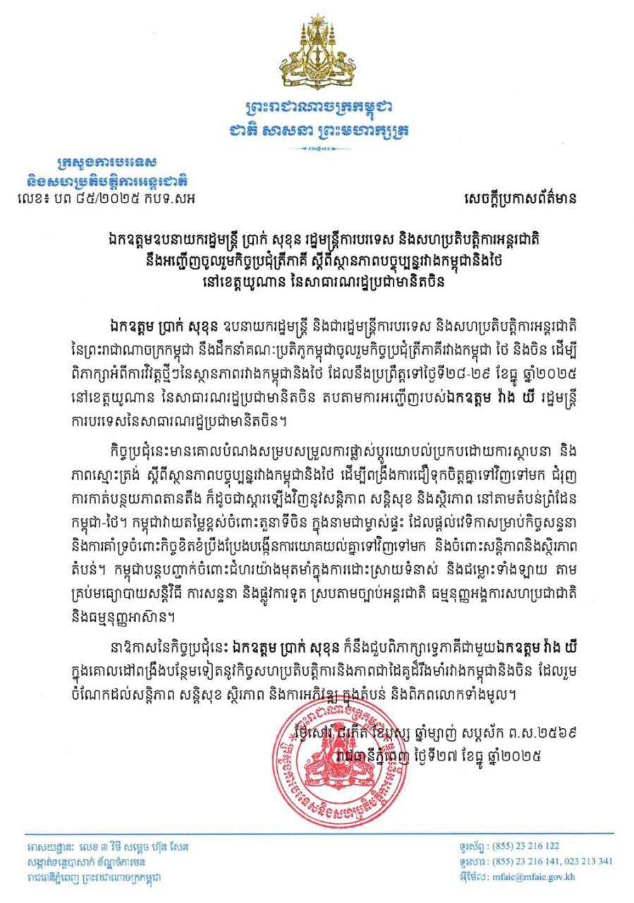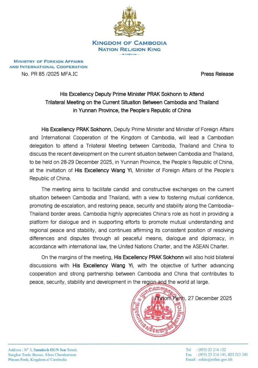 ភ្នំពេញ​៖​ លោក ប្រាក់ សុខុន ឧបនាយករដ្ឋមន្ត្រី និងជារដ្ឋមន្ត្រីការបរទេស និងសហប្រតិបត្តិការអន្តរជាតិ នៃព្រះរាជាណាចក្រកម្ពុជា នឹងដឹកនាំគណៈប្រតិភូកម្ពុជាចូលរួមកិច្ចប្រជុំត្រីភាគីរវាងកម្ពុជា ថៃ និងចិន ដើម្បី ពិភាក្សាអំពីការវិវត្តថ្មីៗនៃស្ថានភាពរវាងកម្ពុជានិងថៃ ដែលនឹងប្រព្រឹត្តទៅថ្ងៃទី២៨-២៩ ខែធ្នូ ឆ្នាំ២០២៥ នៅខេត្តយូណាន នៃសាធារណរដ្ឋប្រជាមានិតចិន តបតាមការអញ្ជើញរបស់លោក វ៉ាង យី រដ្ឋមន្ត្រី ការបរទេសនៃសាធារណរដ្ឋប្រជាមានិតចិន។